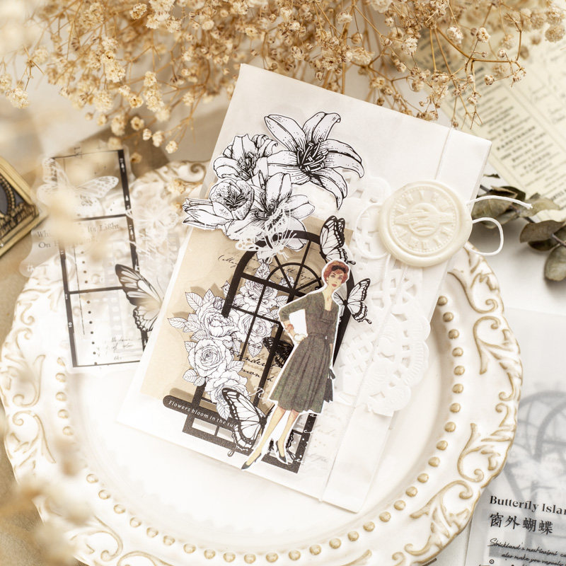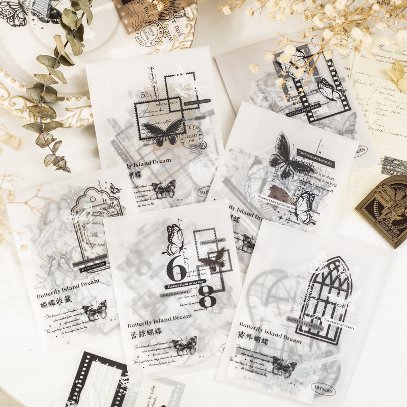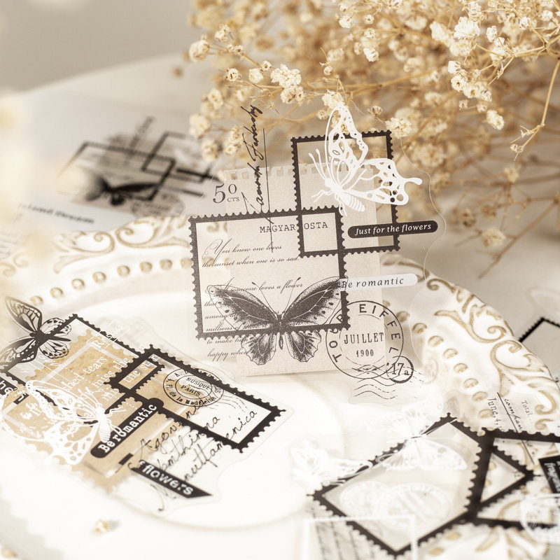 M|蝶屿梦境贴纸包 轻复古透明pet蝴蝶蕾丝胶片自粘手帐拼贴素材