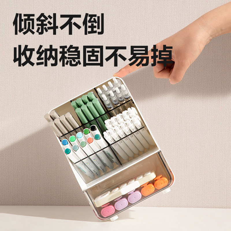 得力多功能斜插笔筒收纳盒抽屉式大容量透明防尘置物架学生办公室工位收纳整理盒分类化妆品收纳整理箱储物盒