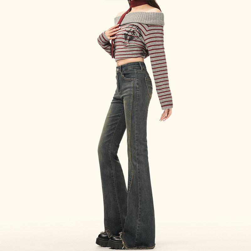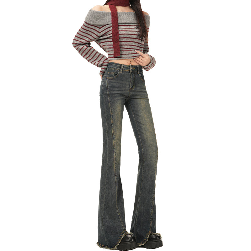 BQERTY美式复古毛边水洗做旧显高显瘦vibe氛围感加绒微喇牛仔裤