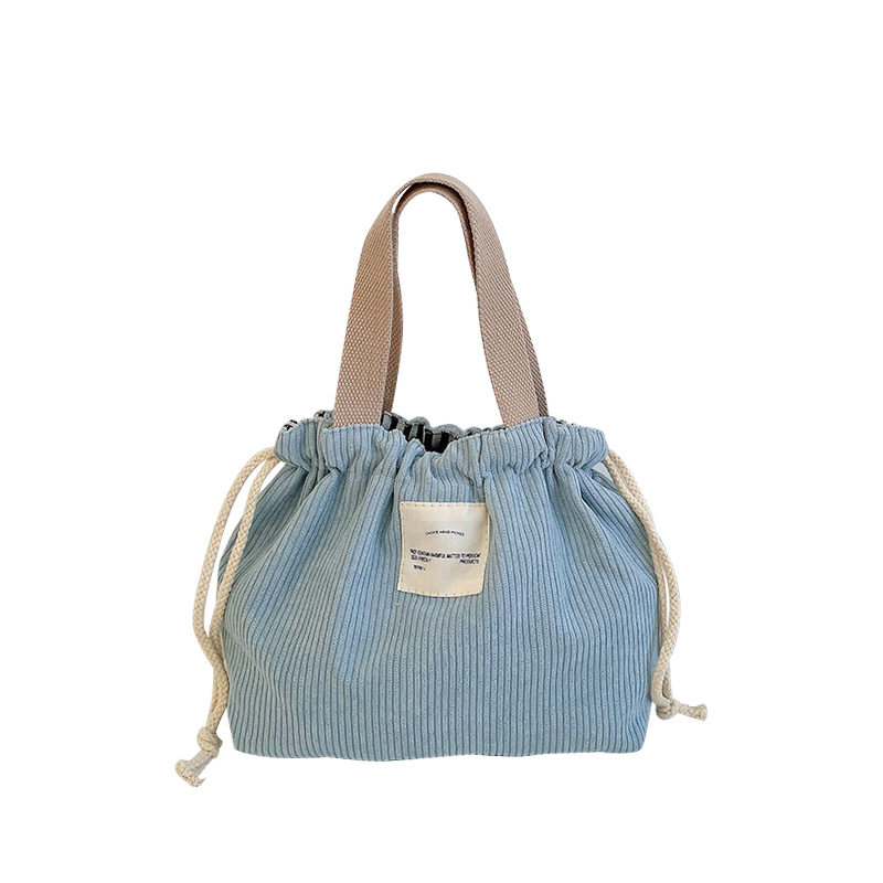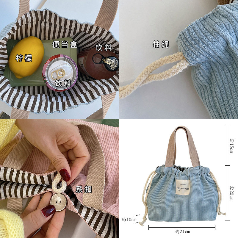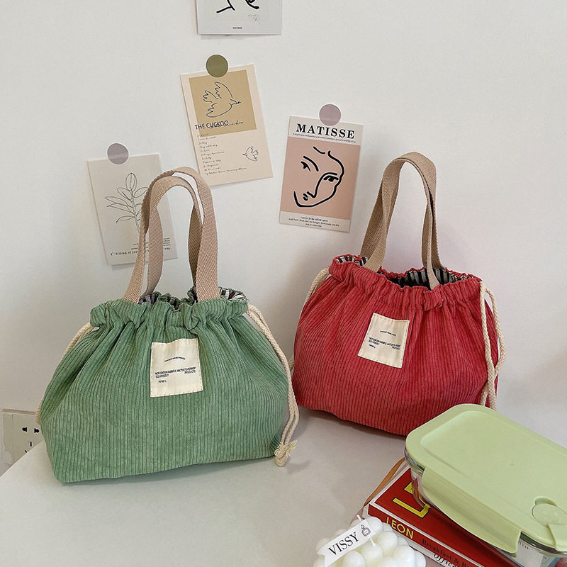 日式简约抽绳灯芯绒糖果色便当袋大容量小众日韩小方包带饭包跨境