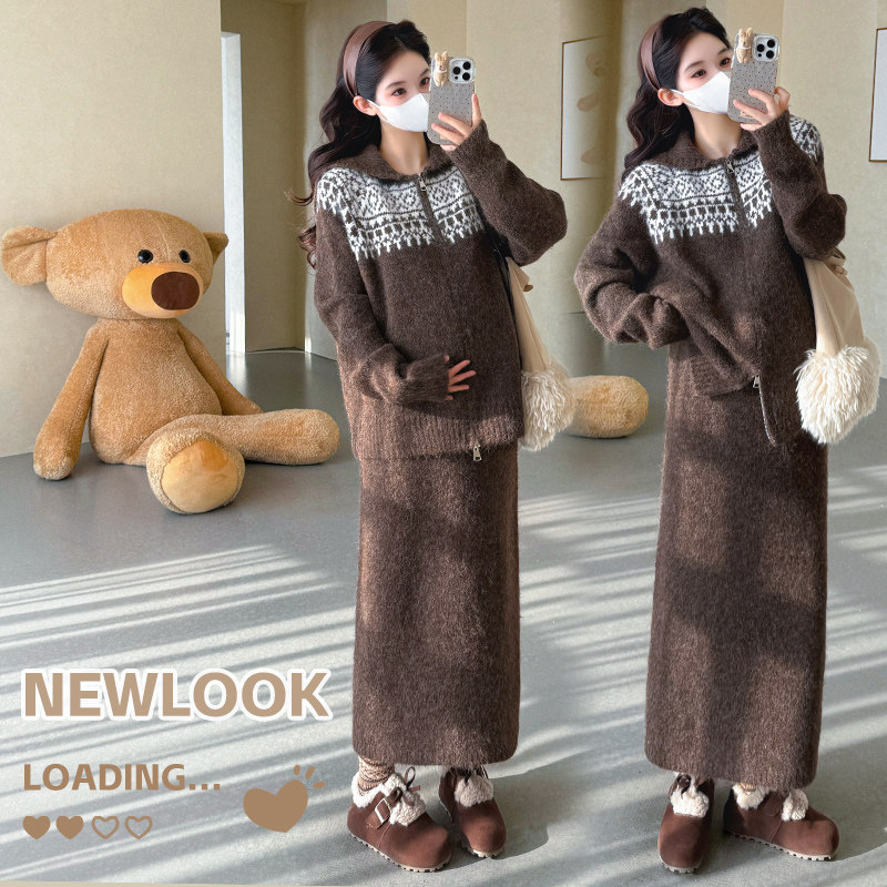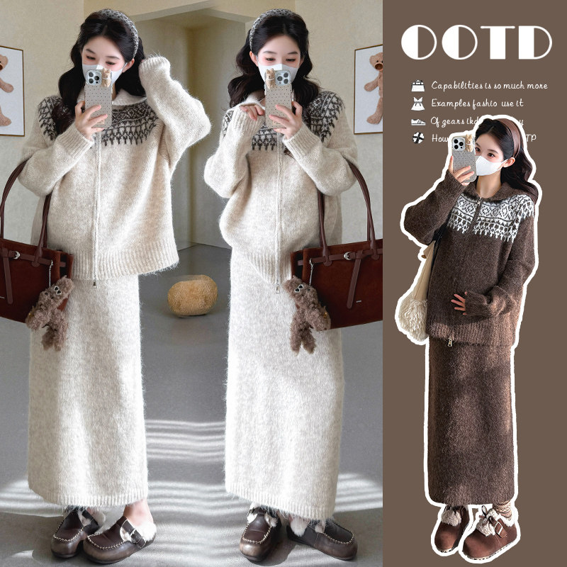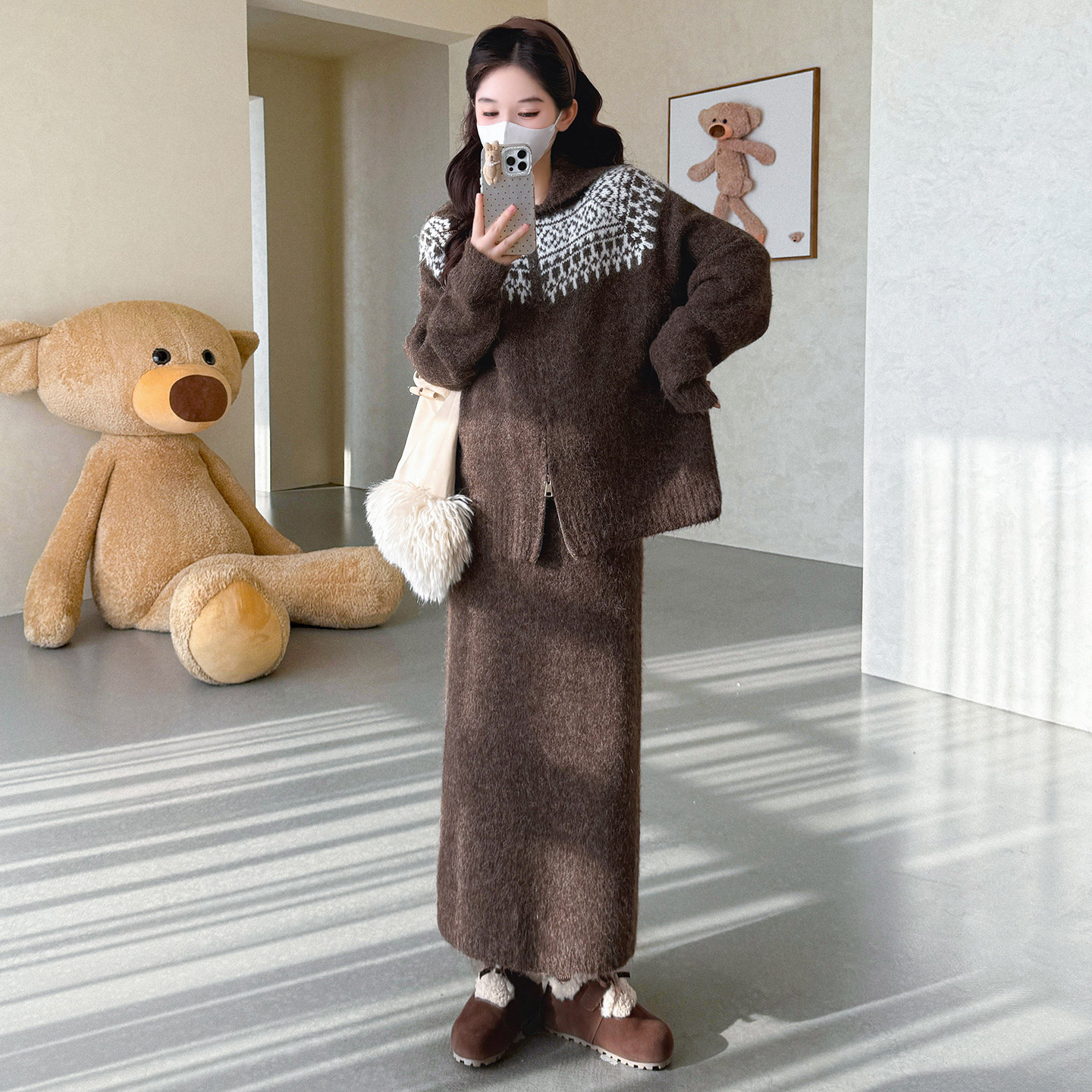 婧麒孕妇装冬装新款洋气费尔岛毛衣外套半身裙子孕期高级孕妇套装