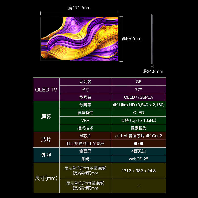 LG OLED77G5PCA 77英寸 165HZ高刷高清游戏电视机 lg77g5