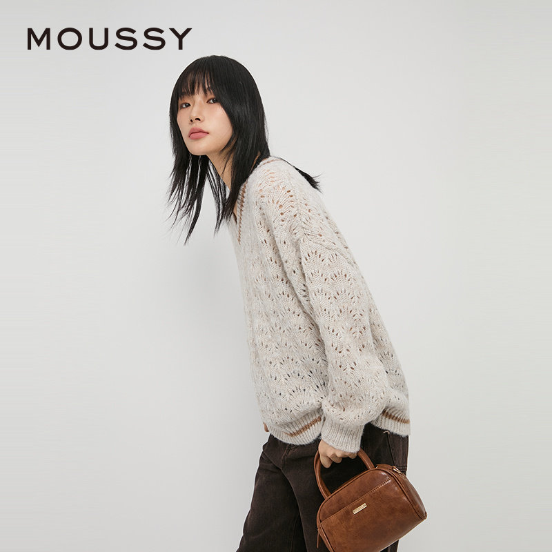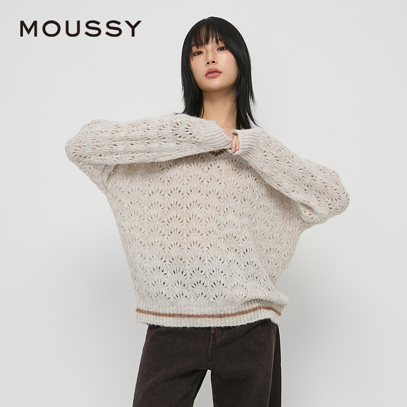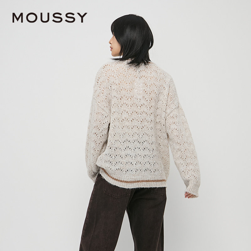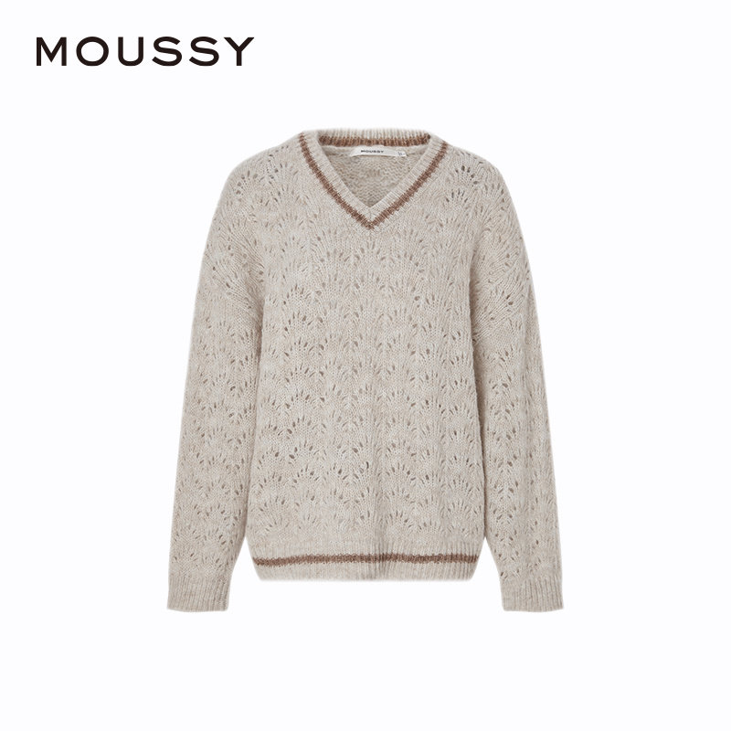 moussy 秋季撞边V领毛绒针织衫慵懒感毛衣028HAZ70-2241