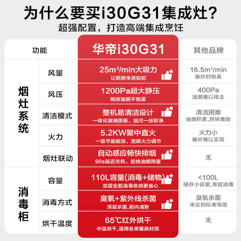 华帝消毒柜集成灶i30G31全腔二星级消毒家用一体灶抽油烟机燃气灶