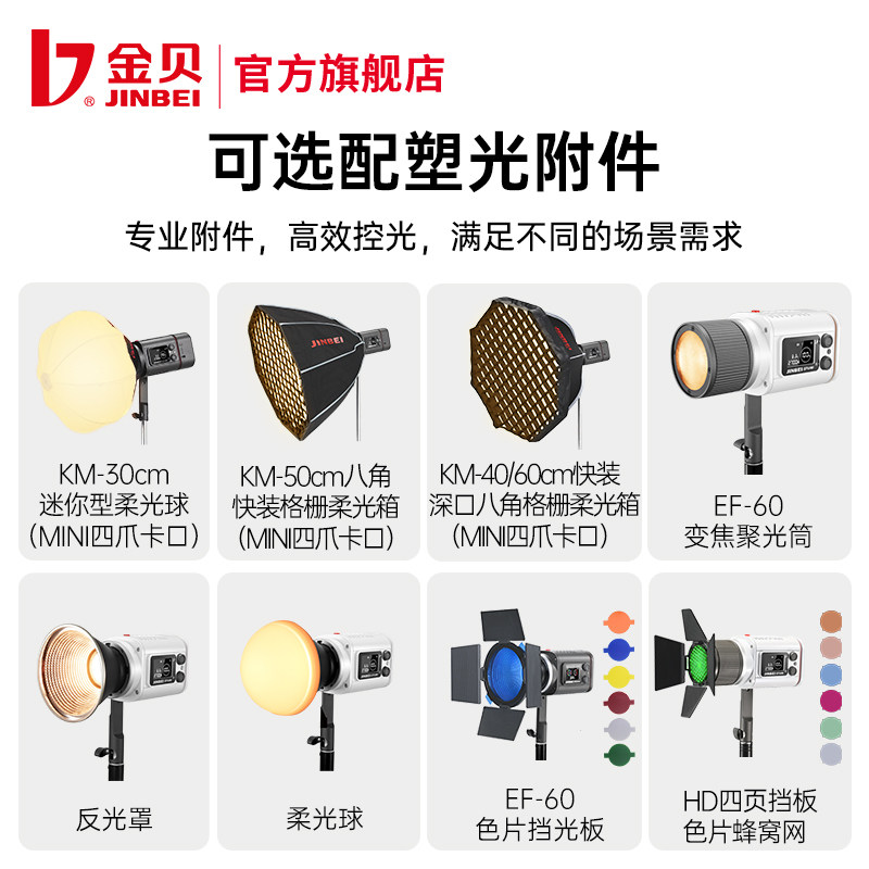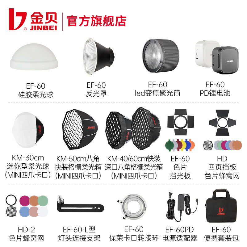 金贝EF60BI/RGB塑光附件柔光球蜂窝网色片反光罩四页挡板硅胶柔光球变焦聚光筒八角格栅柔光箱锂电池充电器