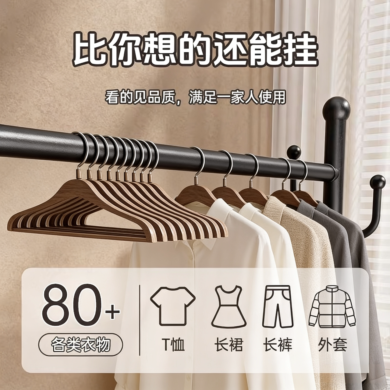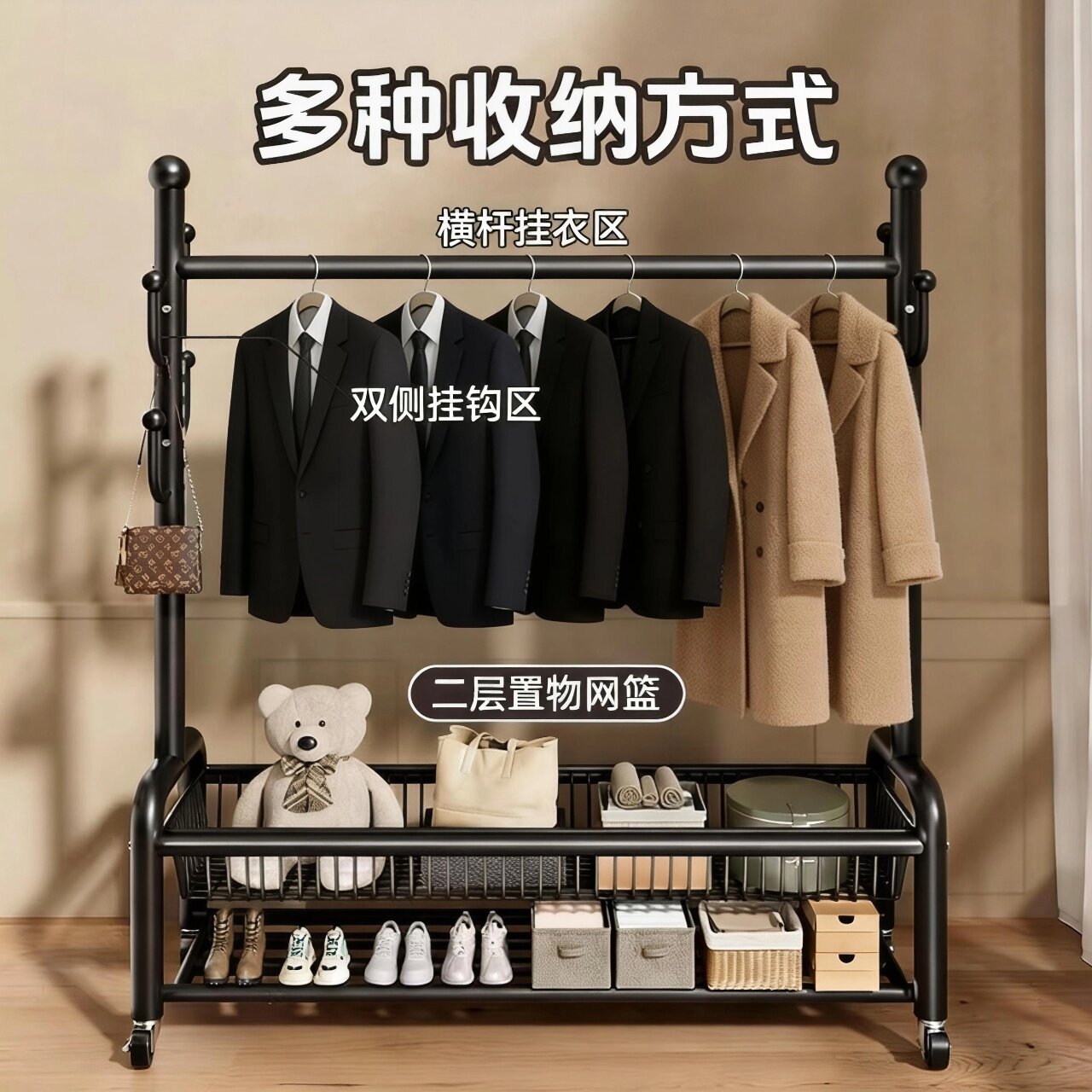 加粗落地晾衣架家用卧室衣帽架阳台挂衣置物一体简易收纳神器双层