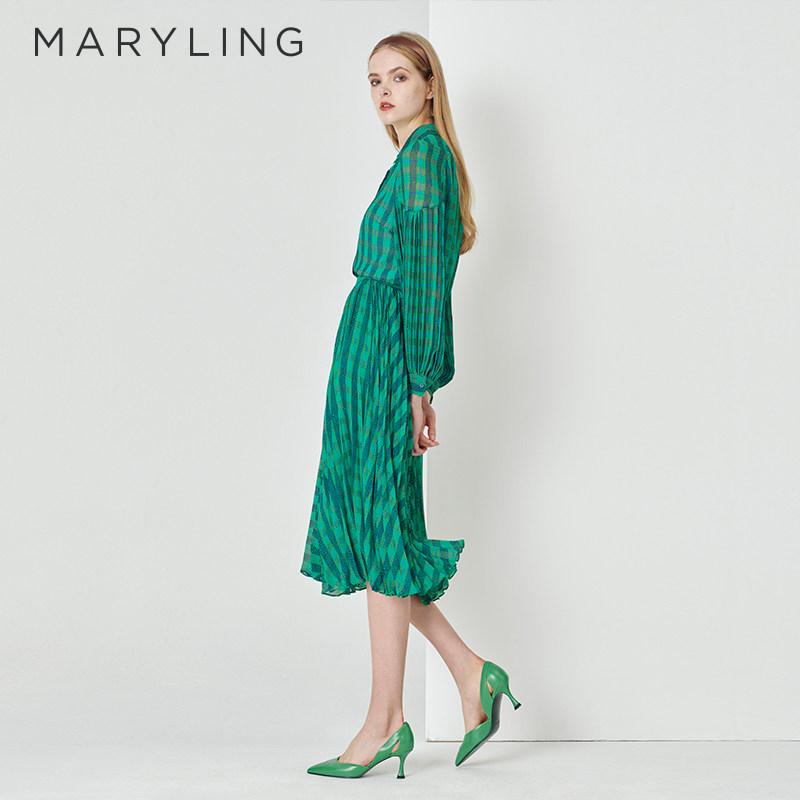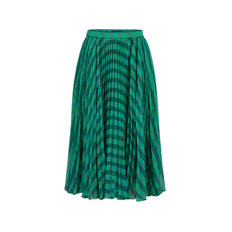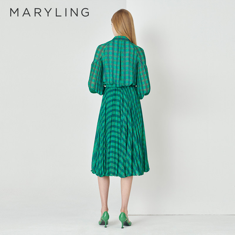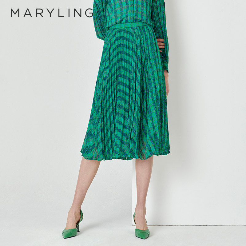 MARYLING玛俪琳春秋蓝绿方格印花千鸟格百褶半裙A1DAW72020