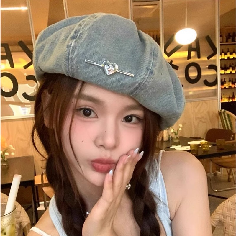 爱心蓝色水洗牛仔贝雷帽女报童帽透气八角画家帽大头围显脸小帽子