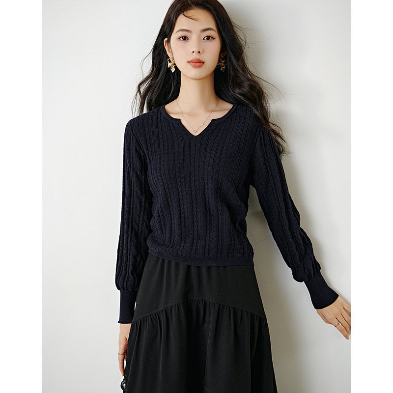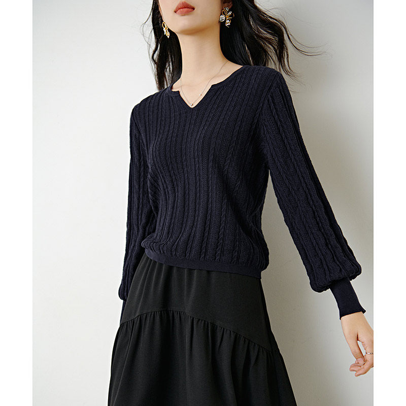 晚白2026年春新款时尚绞花V领棉质毛衣莱赛尔亲肤舒适针织衫女