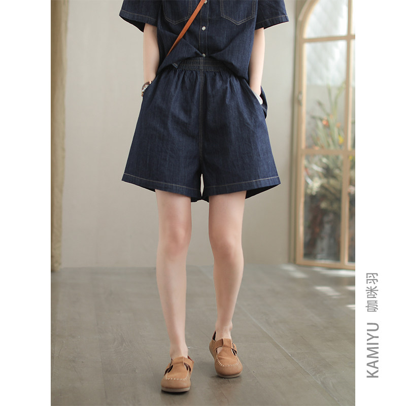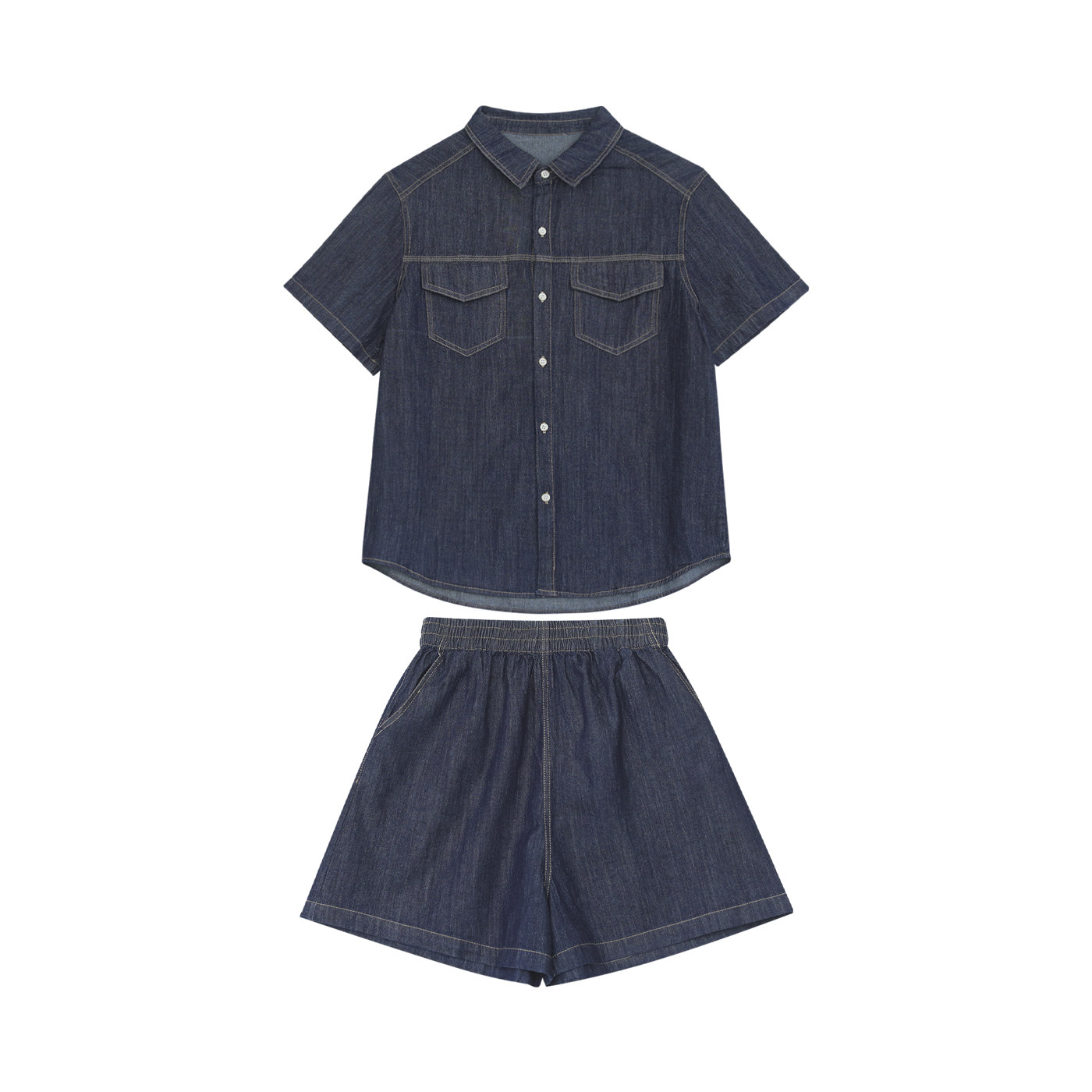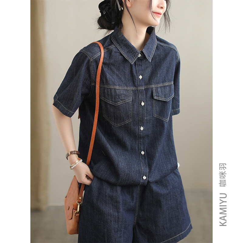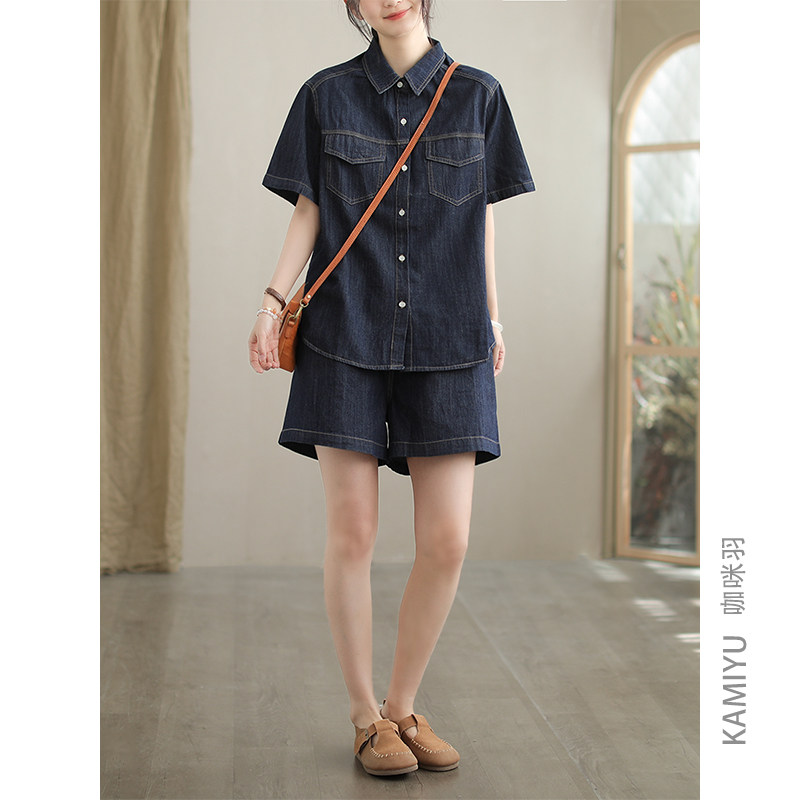 咖咪羽100%棉牛仔套装女纯色百搭短裤复古时尚休闲女装牛仔上衣