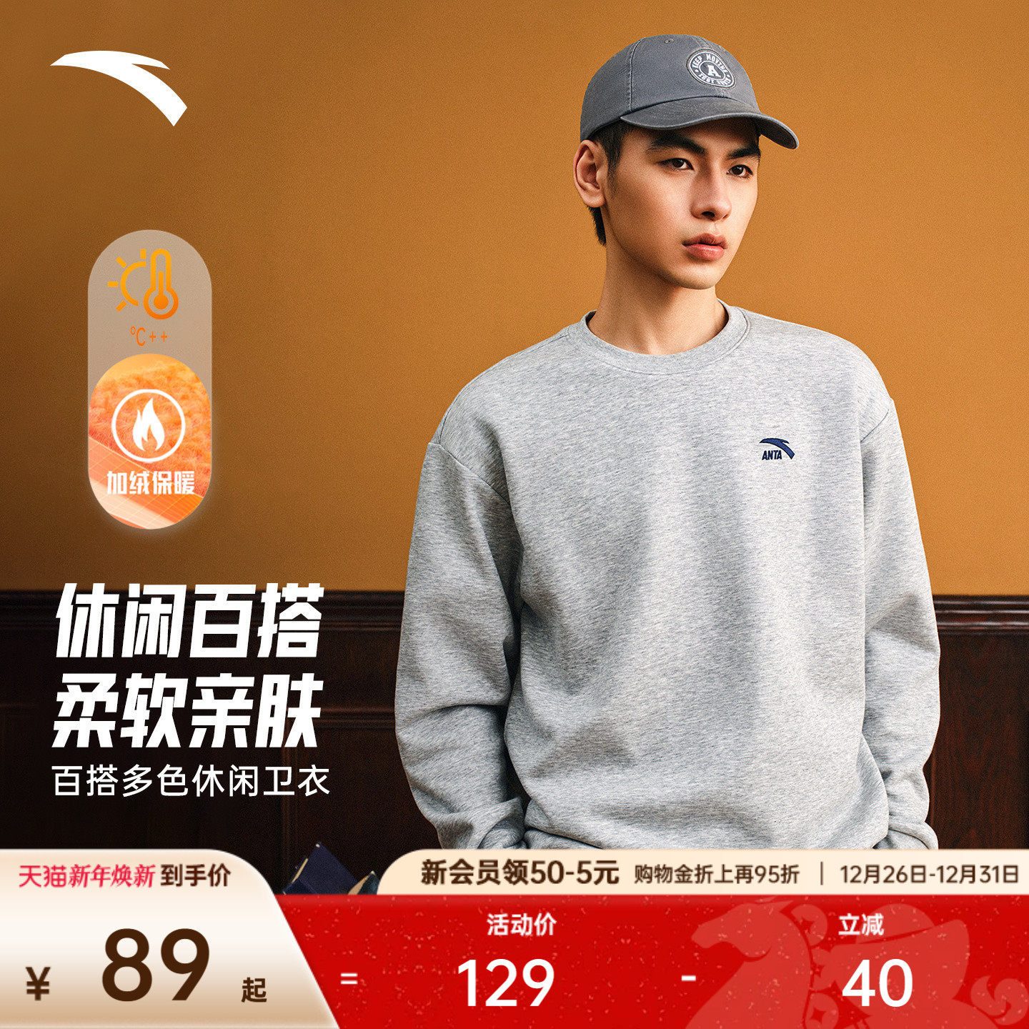 安踏加绒卫衣男保暖圆领套头衫男款2025冬季加厚宽松男士运动上衣
