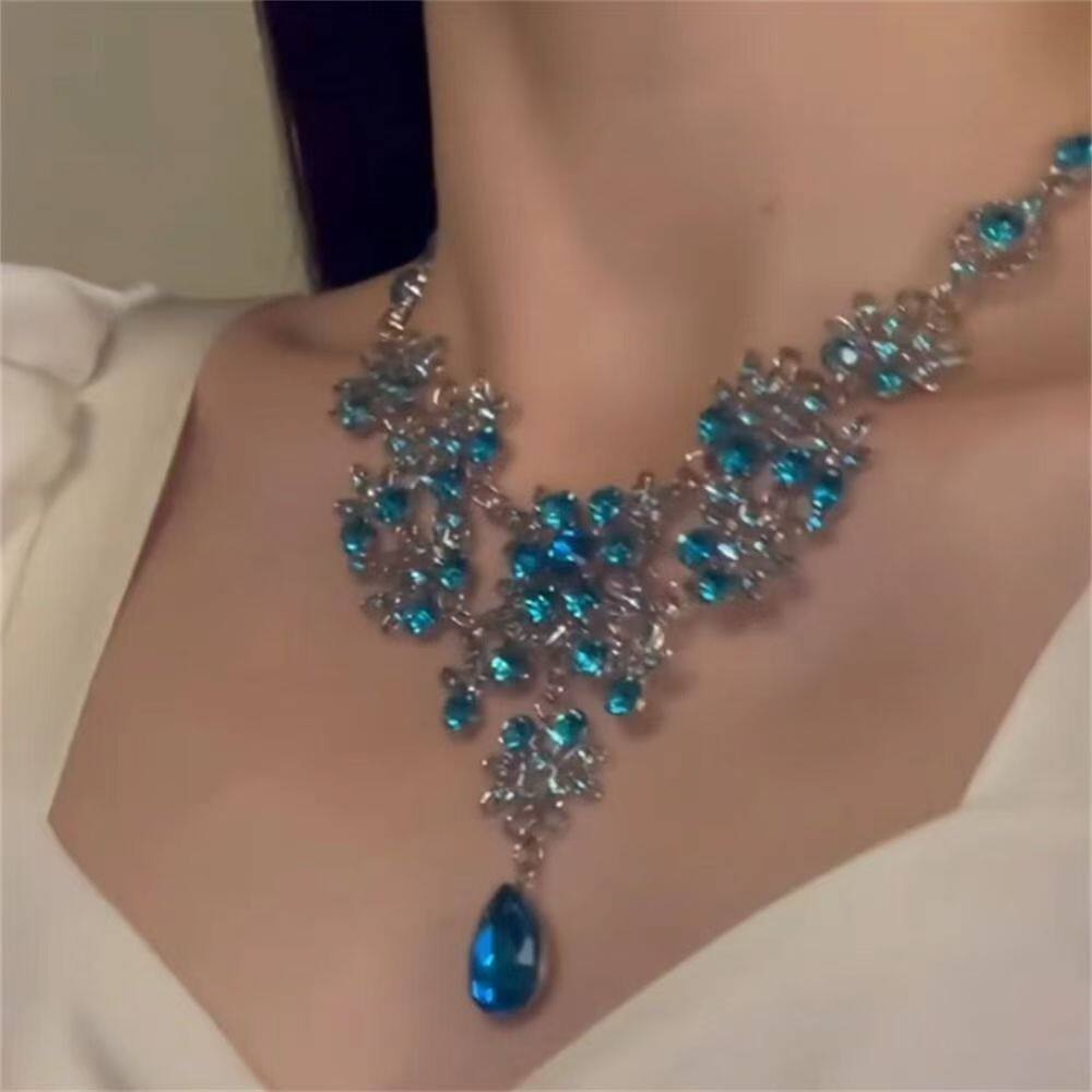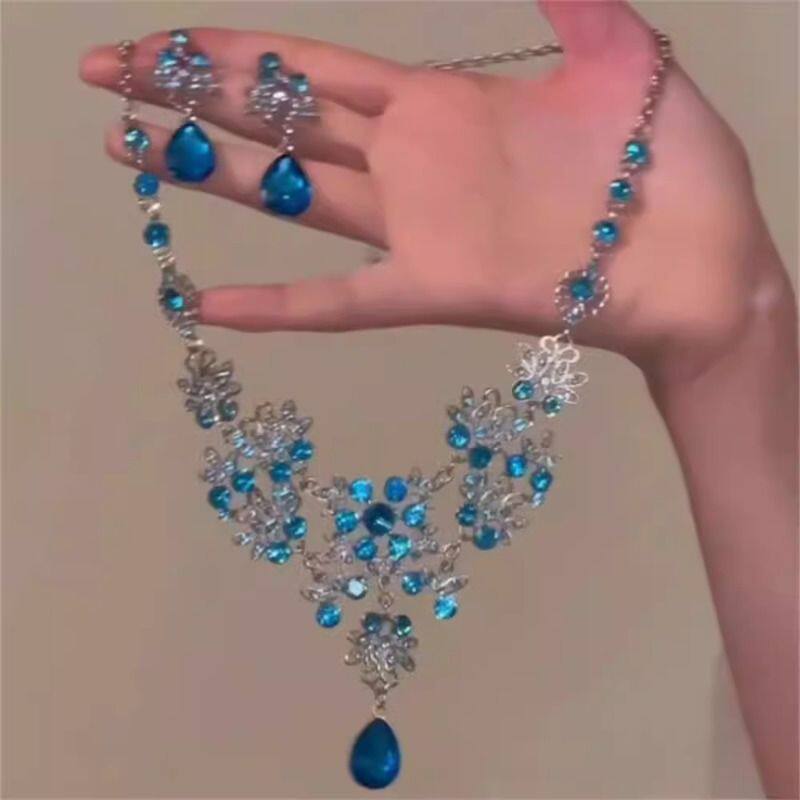 秋冬新款超闪蓝色水滴锆石项链套装女高级感晚宴礼服配饰锁骨链潮