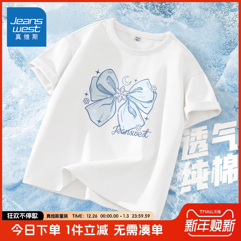 真维斯童装女童短袖t恤女孩夏季白色蝴蝶结体恤儿童纯棉半袖夏装