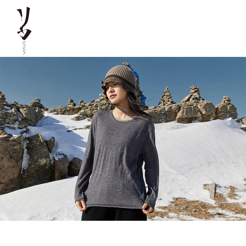 100%拉绒山羊绒+绵羊毛无缝一体亲肤柔软针织拉绒圆V领宽松打底衫