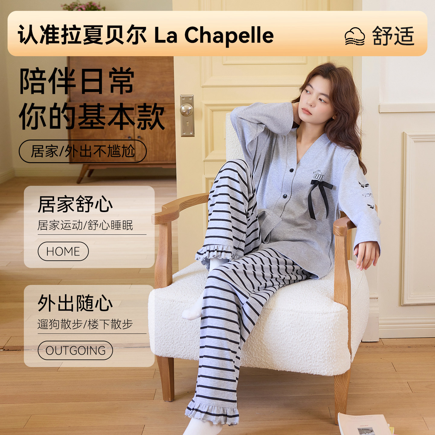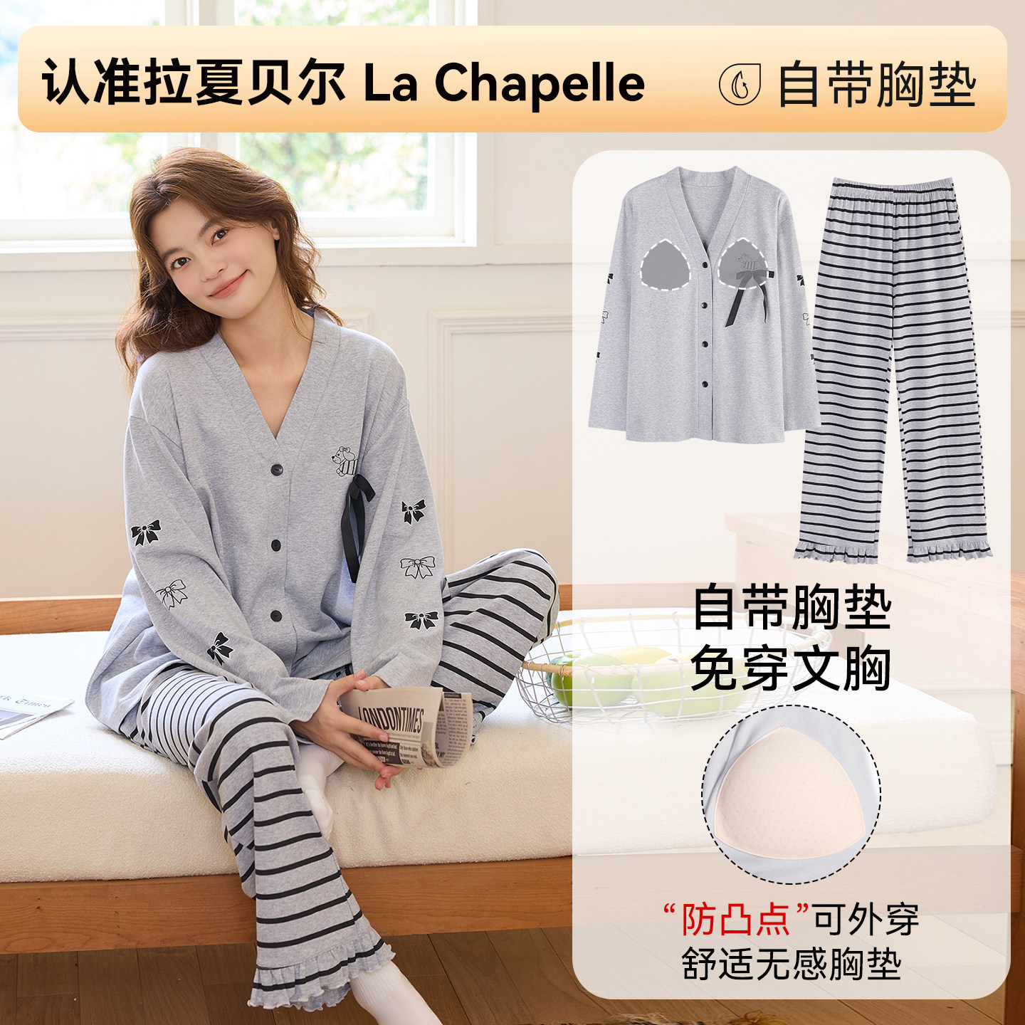 拉夏贝尔纯棉睡衣女款带胸垫春新款女生宿舍可外出女士家居服套装