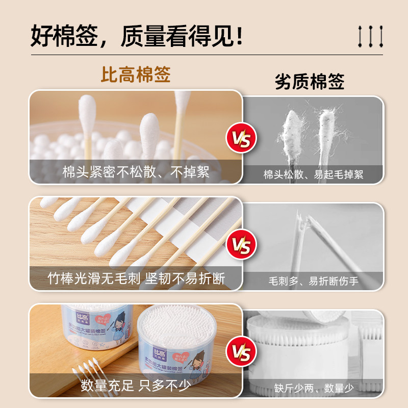比高棉签双头一次性化妆用棉棒卸妆棉花尖头挖耳不掉毛掏耳朵专用