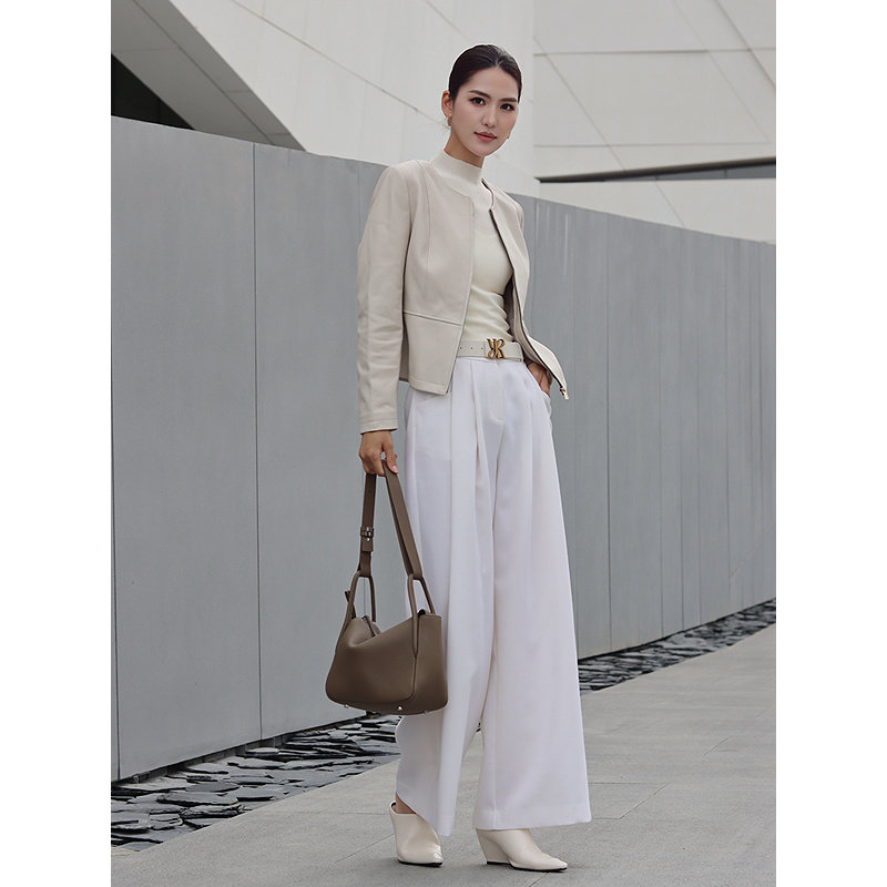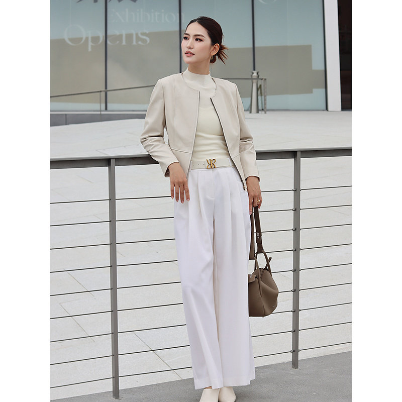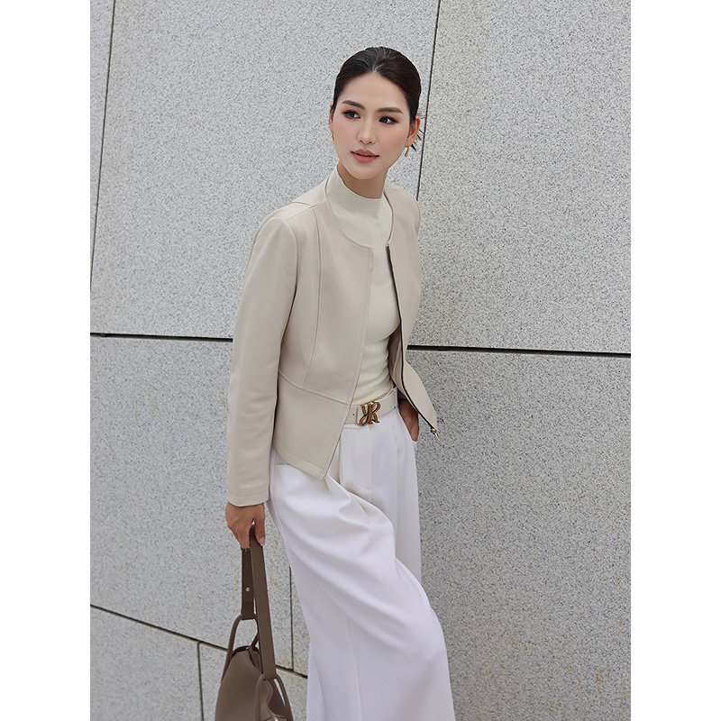 YINER音儿专选2026春季新款时尚圆领羊皮革真皮皮衣短款夹克外套