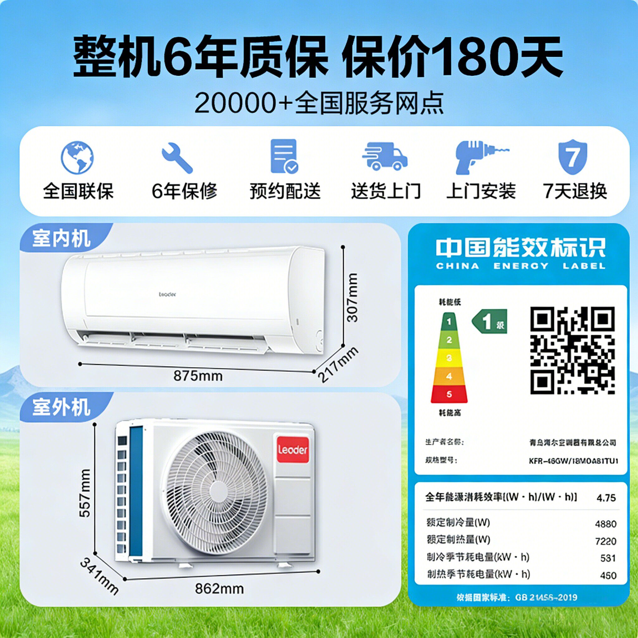 【纯铜管】海尔空调1.5匹1匹一级变频冷暖卧室挂机净省电E1旗舰店