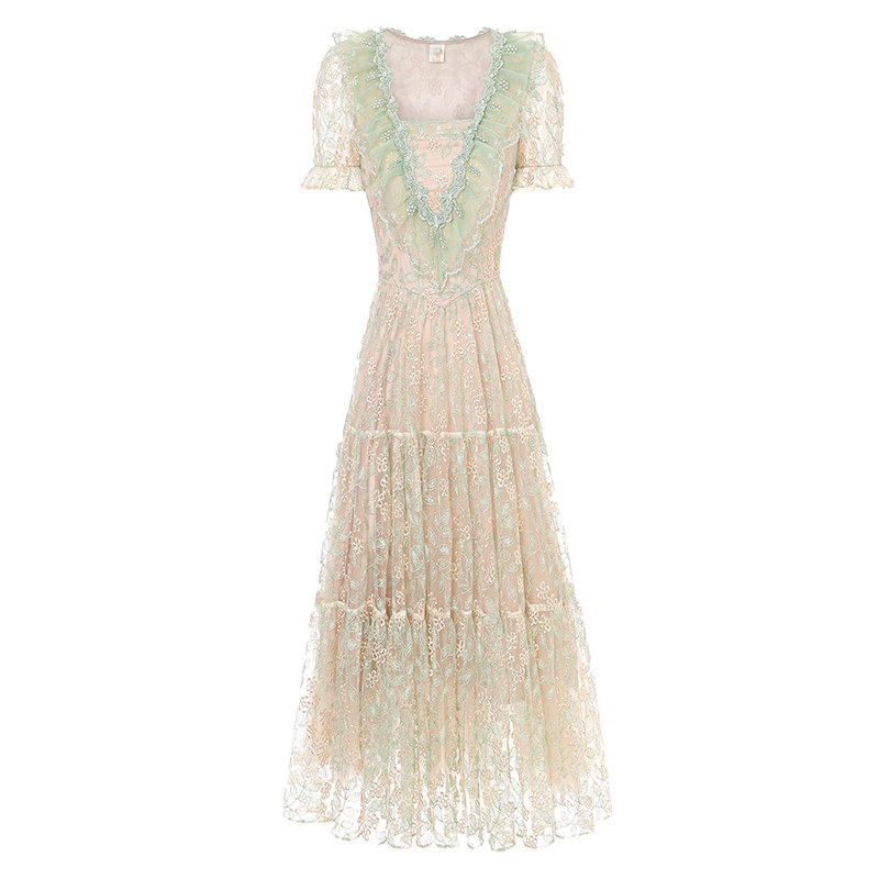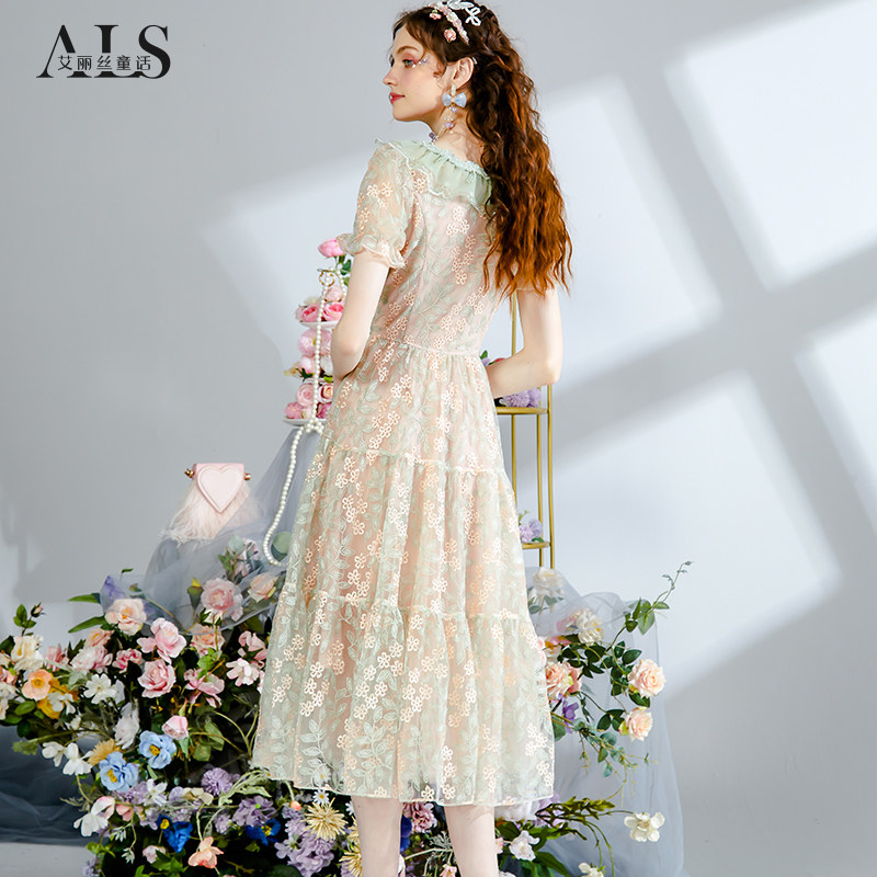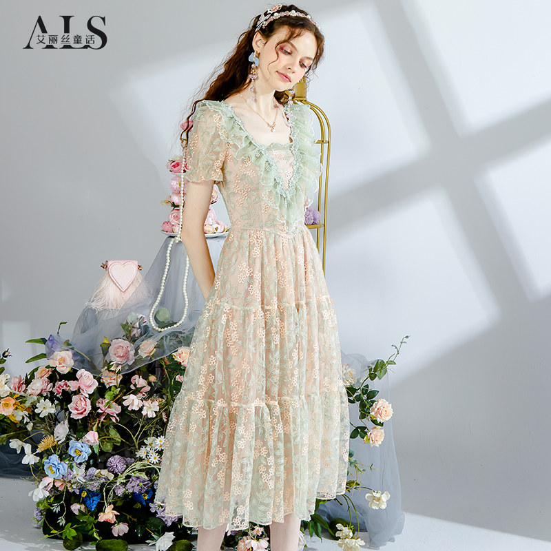 艾丽丝2025夏季新款法式温柔风气质公主裙重工刺绣网纱连衣裙女