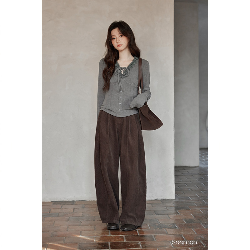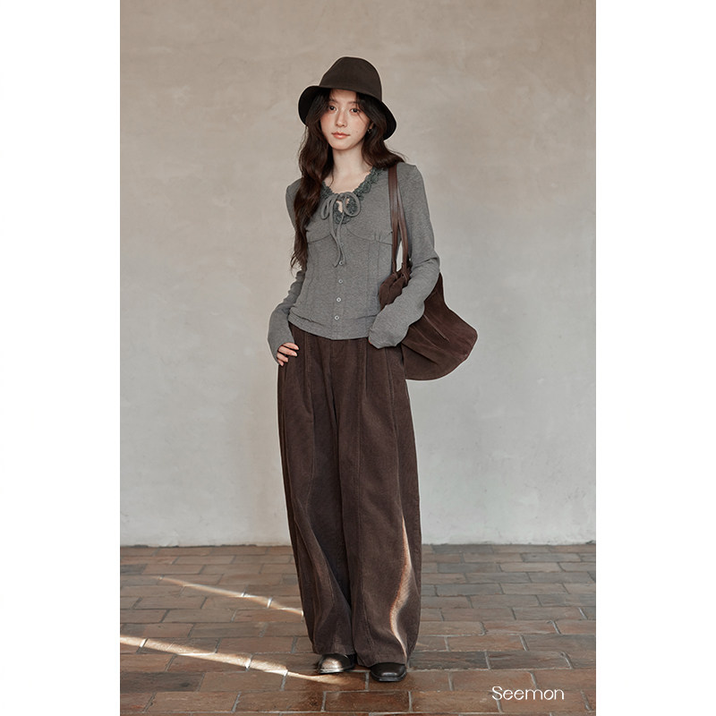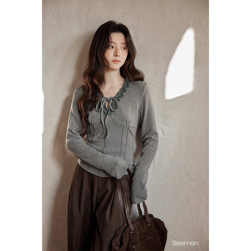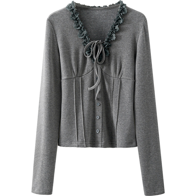 夕蒙2025新款冬季韩系气质上衣小众蕾丝拼接v领灰色系带长袖t恤