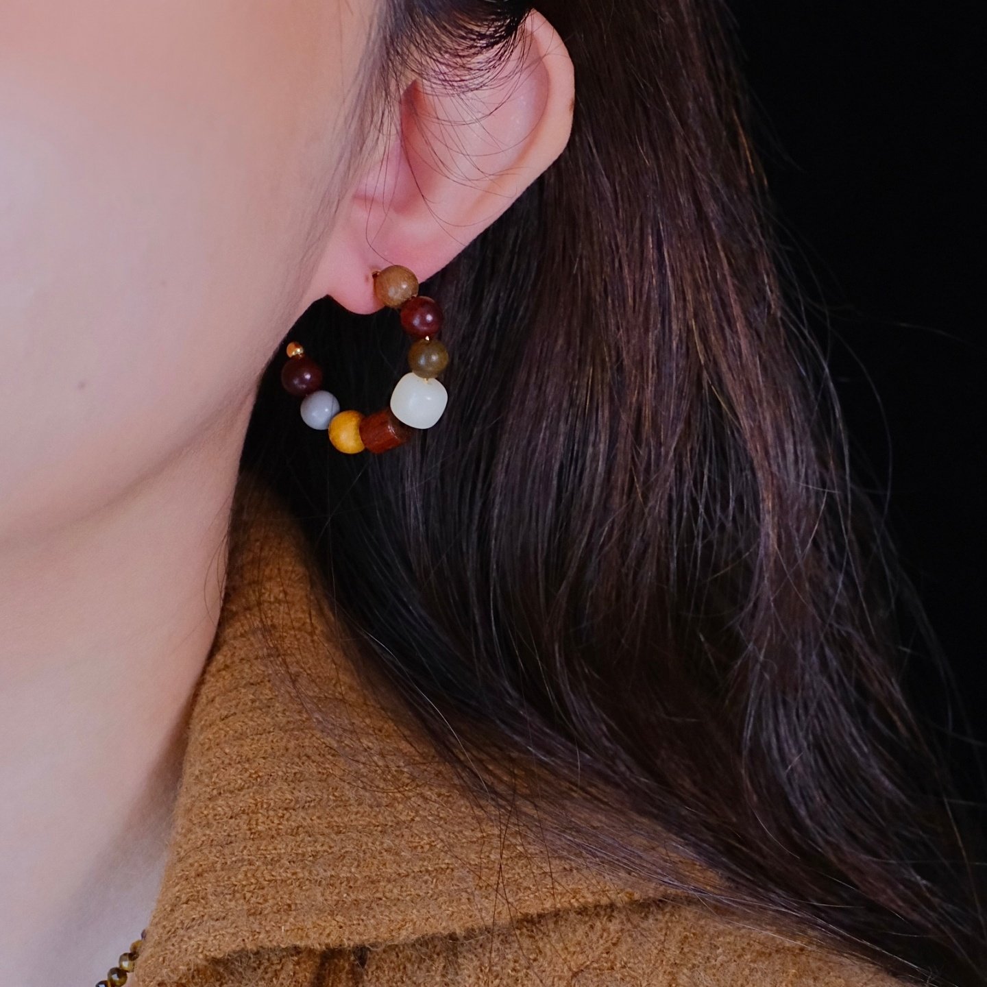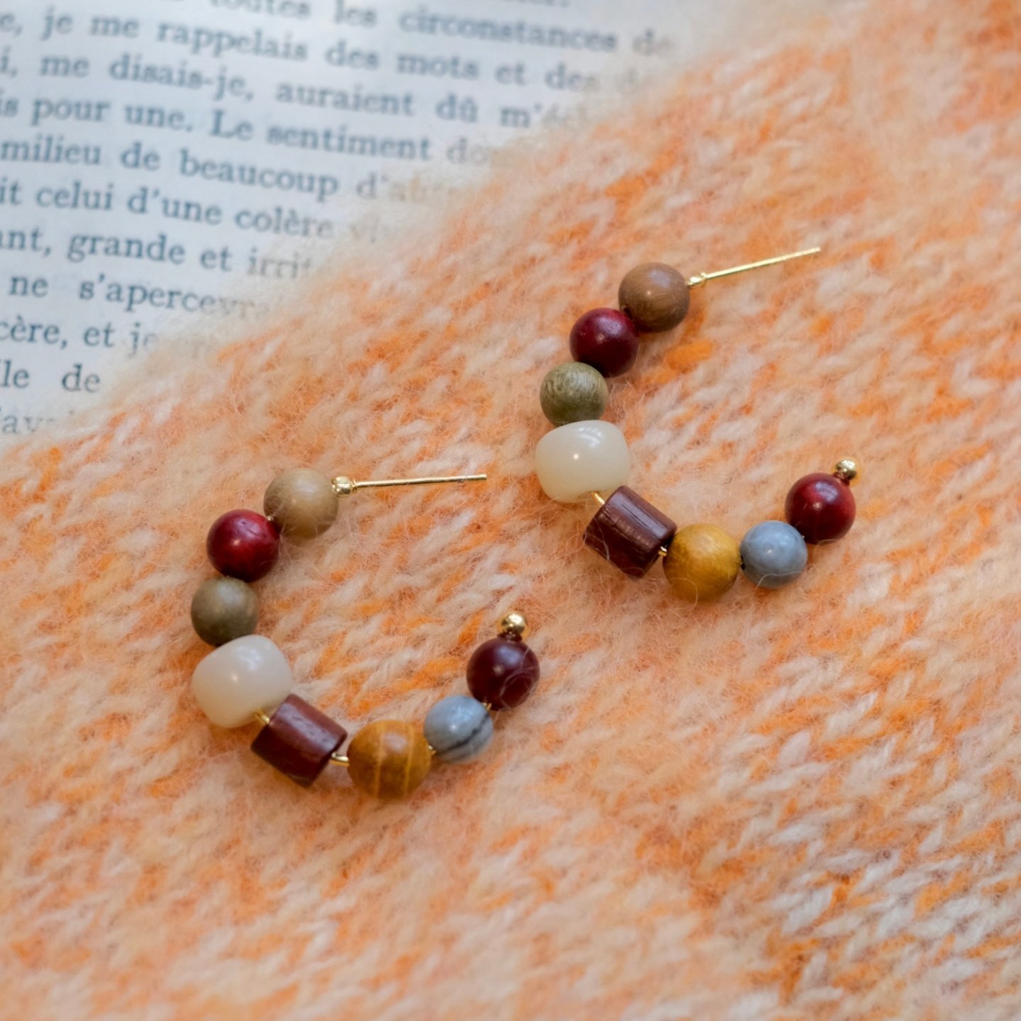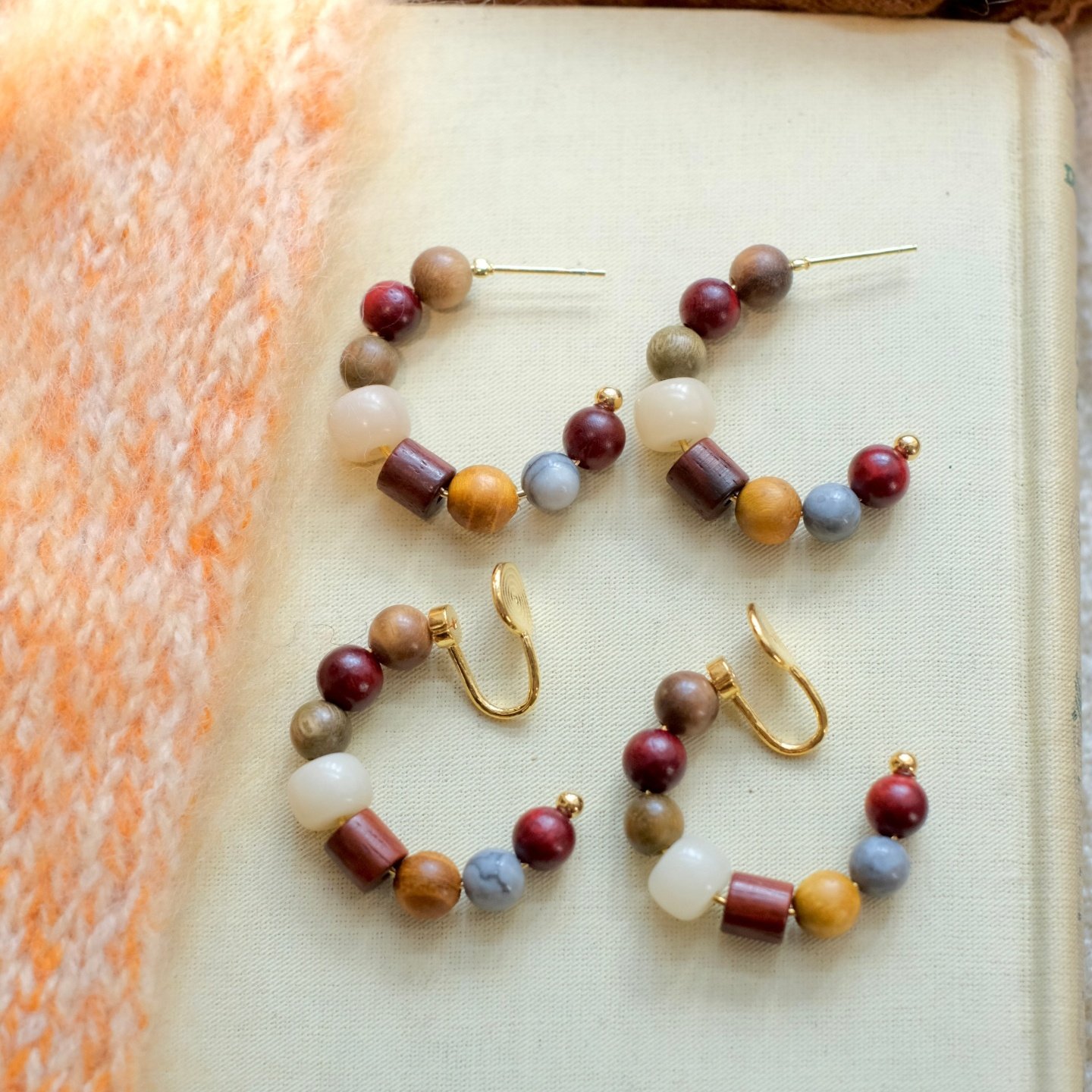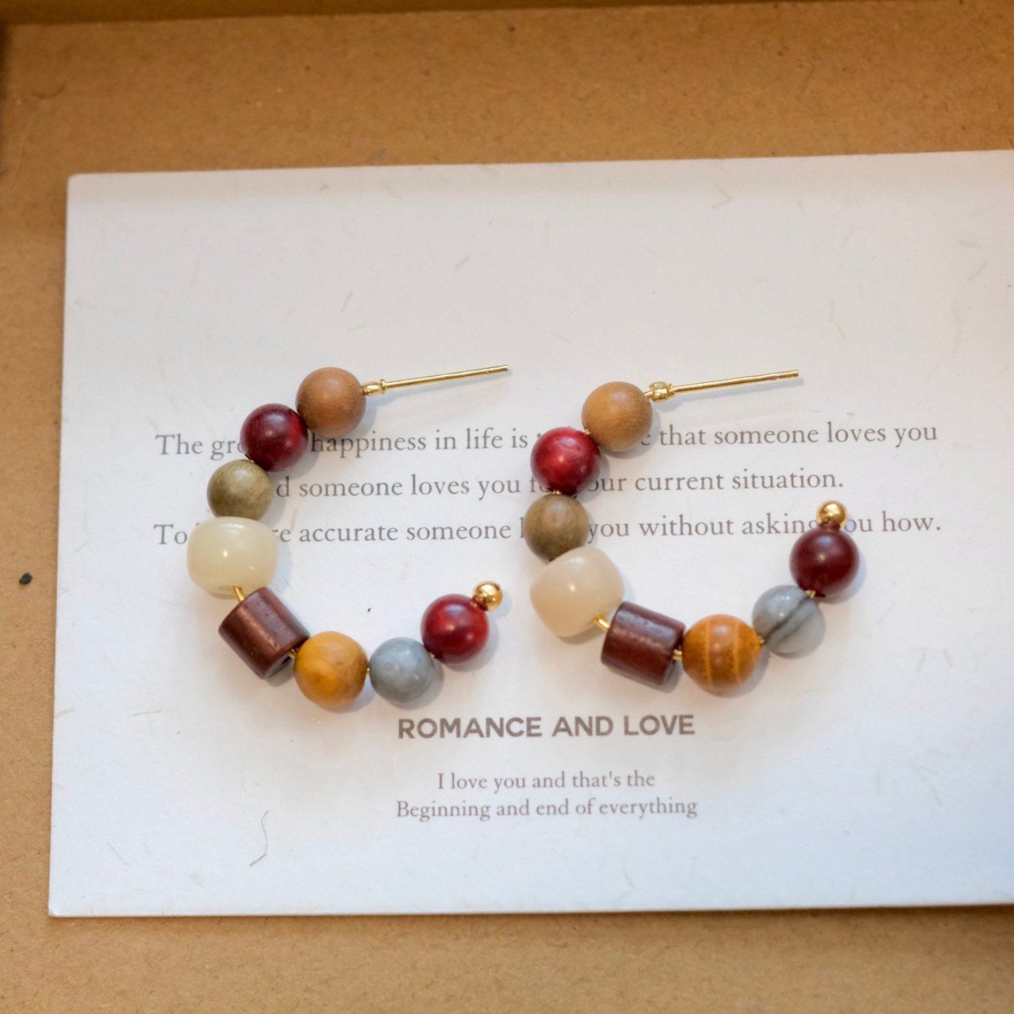 《陶木之息》秋冬复古禅意彩色木质串珠撞色C形圆圈耳环耳饰耳夹