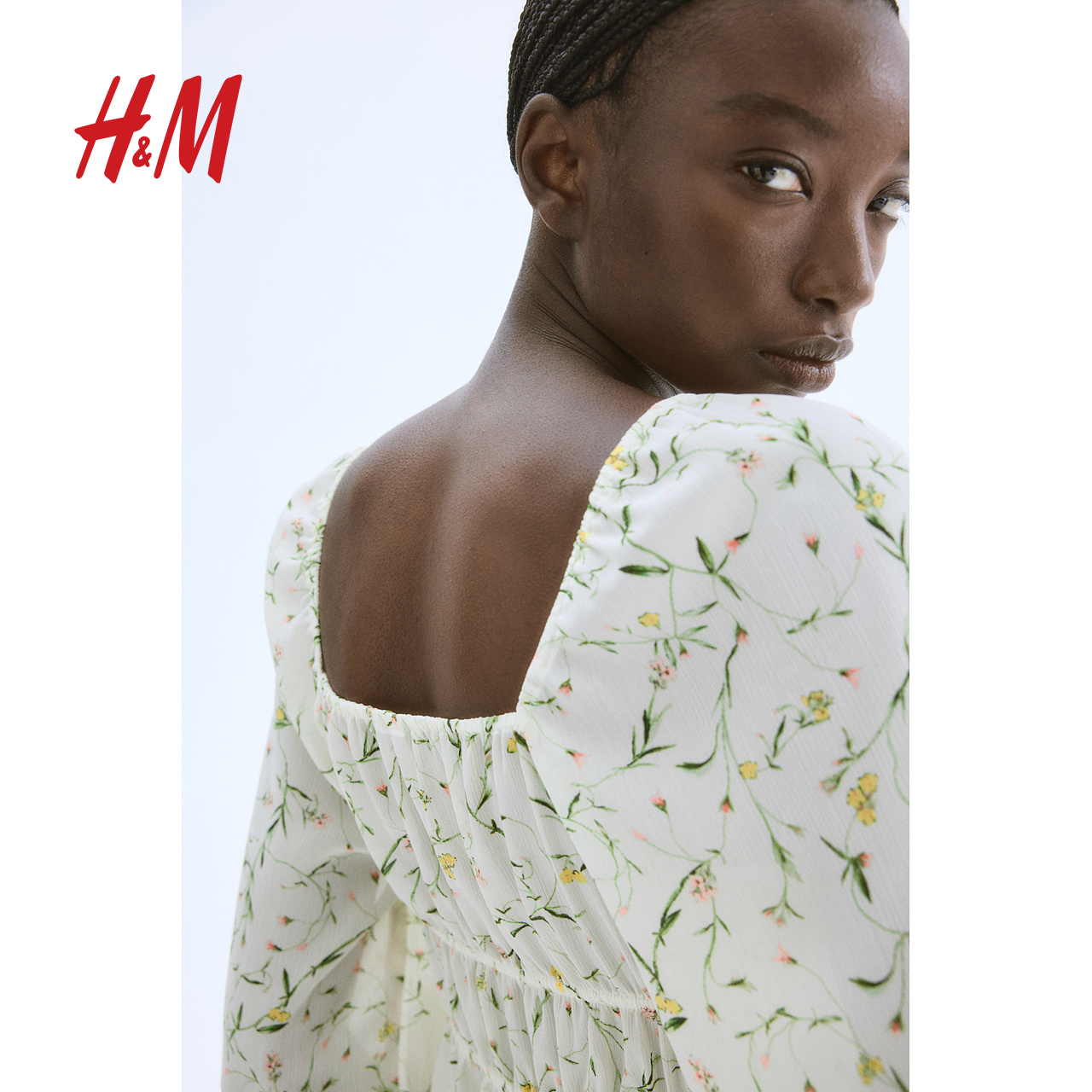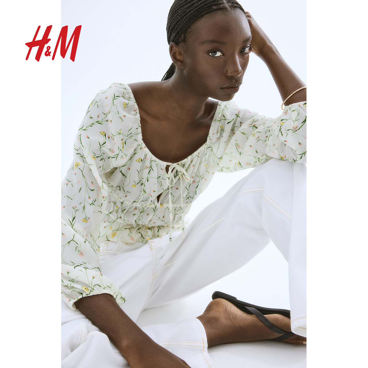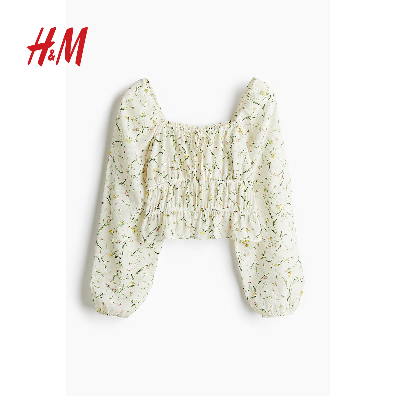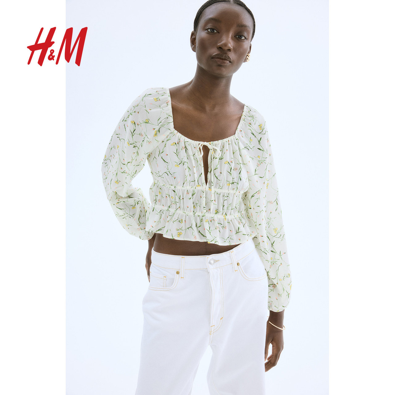 HM女装衬衫2025冬季新款时尚皱感印花清新长袖灯笼袖上衣1274081