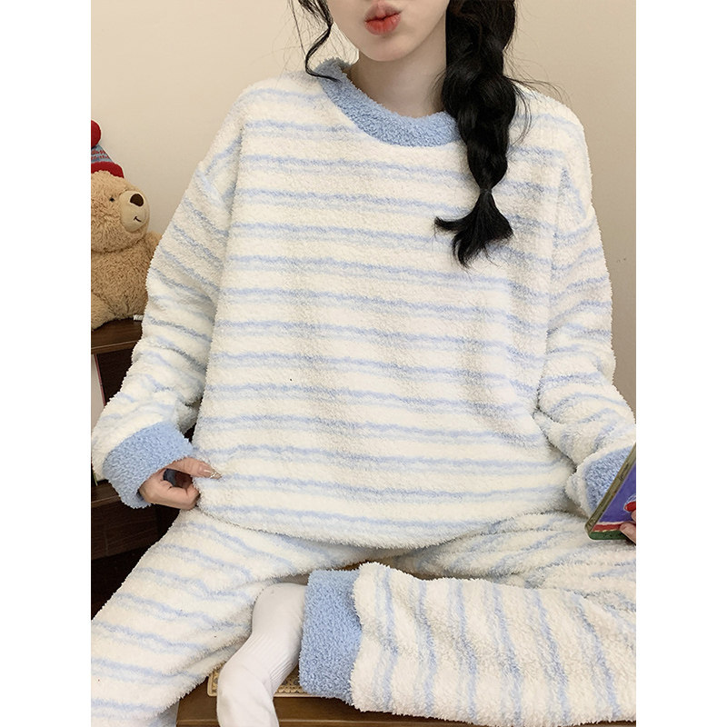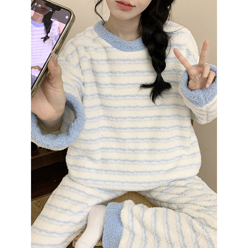 长袖半边绒睡衣女秋冬季加厚珊瑚绒女士休闲条纹家居服冬天可外穿