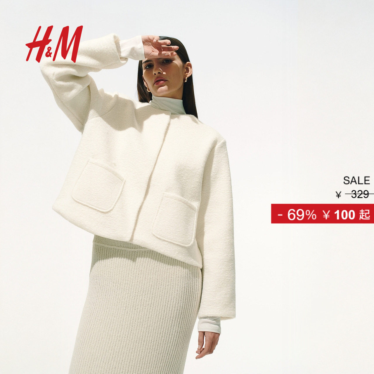 HM女装短外套冬季圆领针织长袖廓形小香风外套1260477