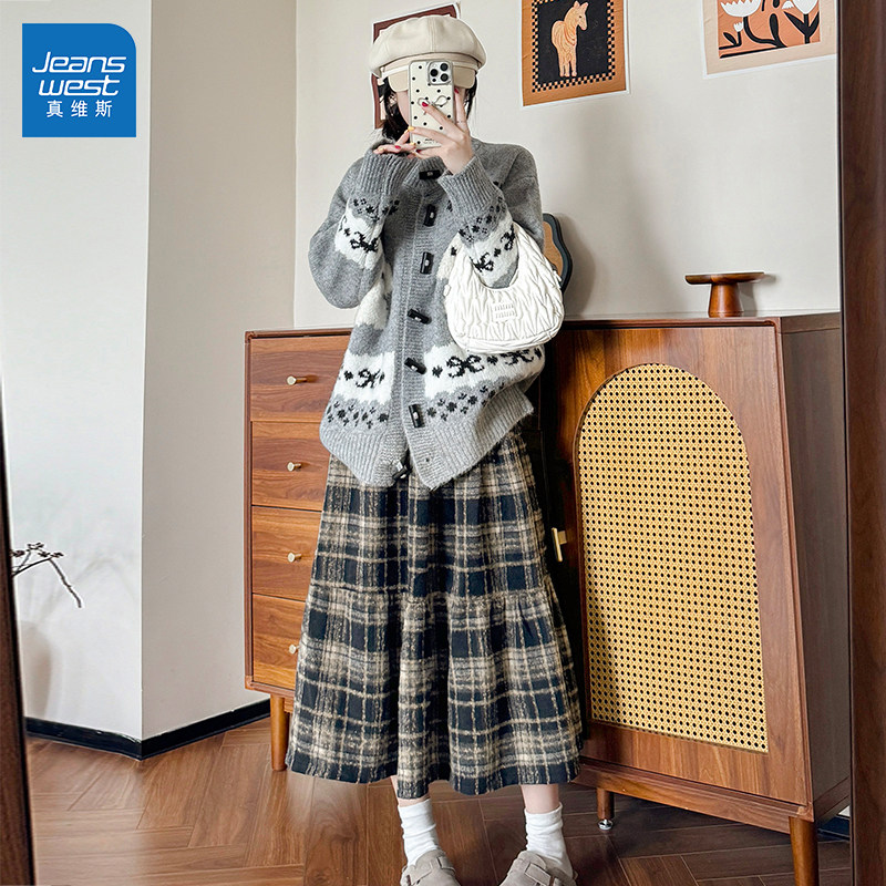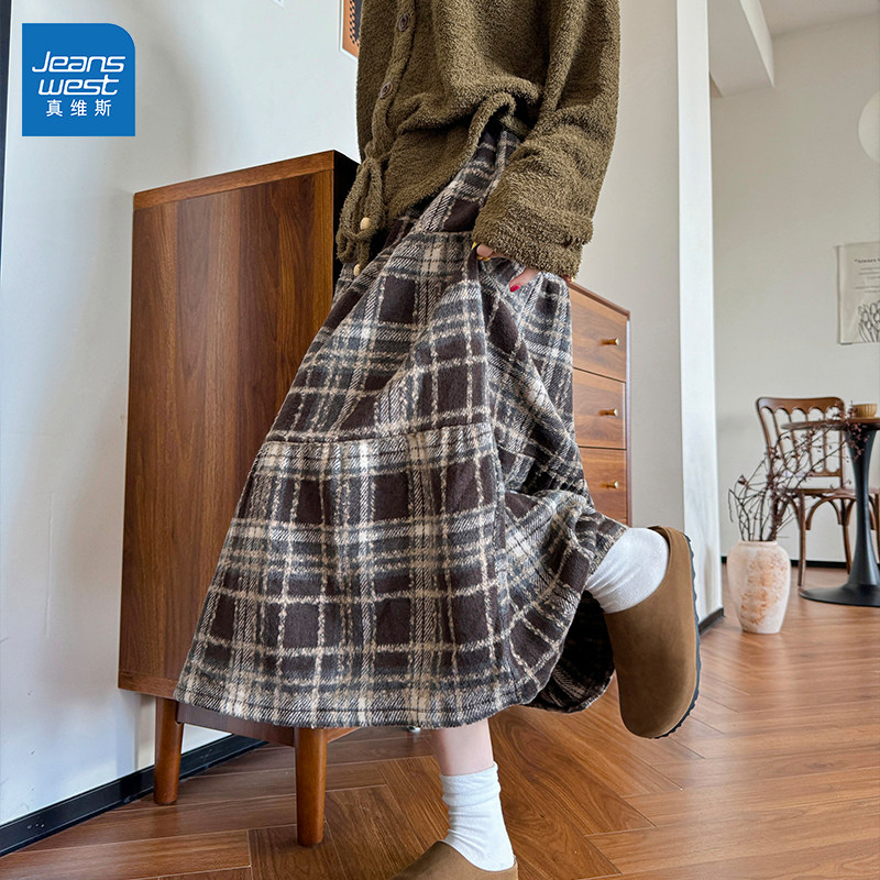 GL真维斯毛呢格子半身裙女2025冬季新款韩系慵懒风中长款蛋糕裙女