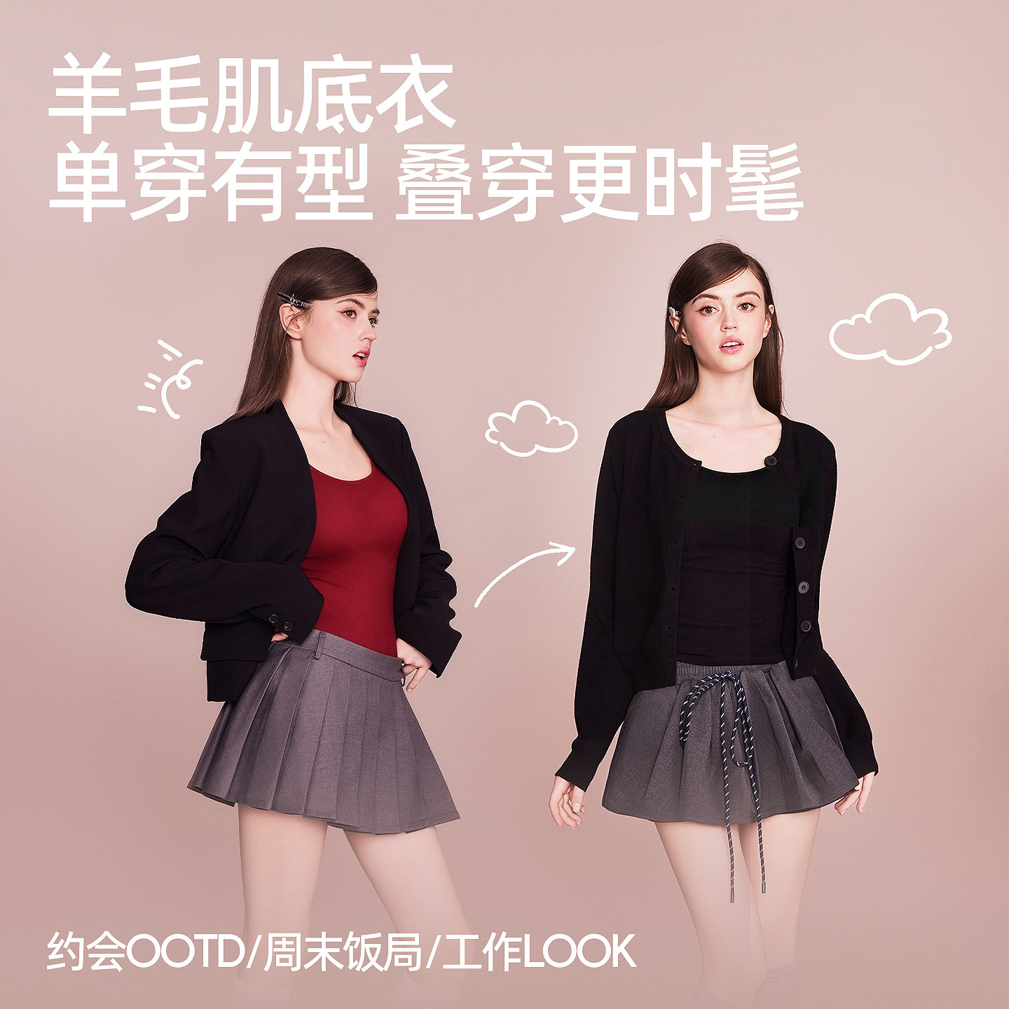 好奇蜜斯羊毛保暖内衣女发热抗静电肌底衣秋冬内搭带胸垫加绒秋衣