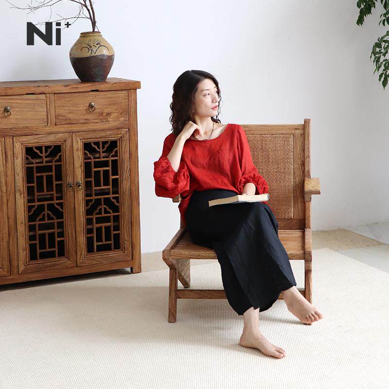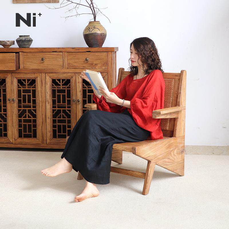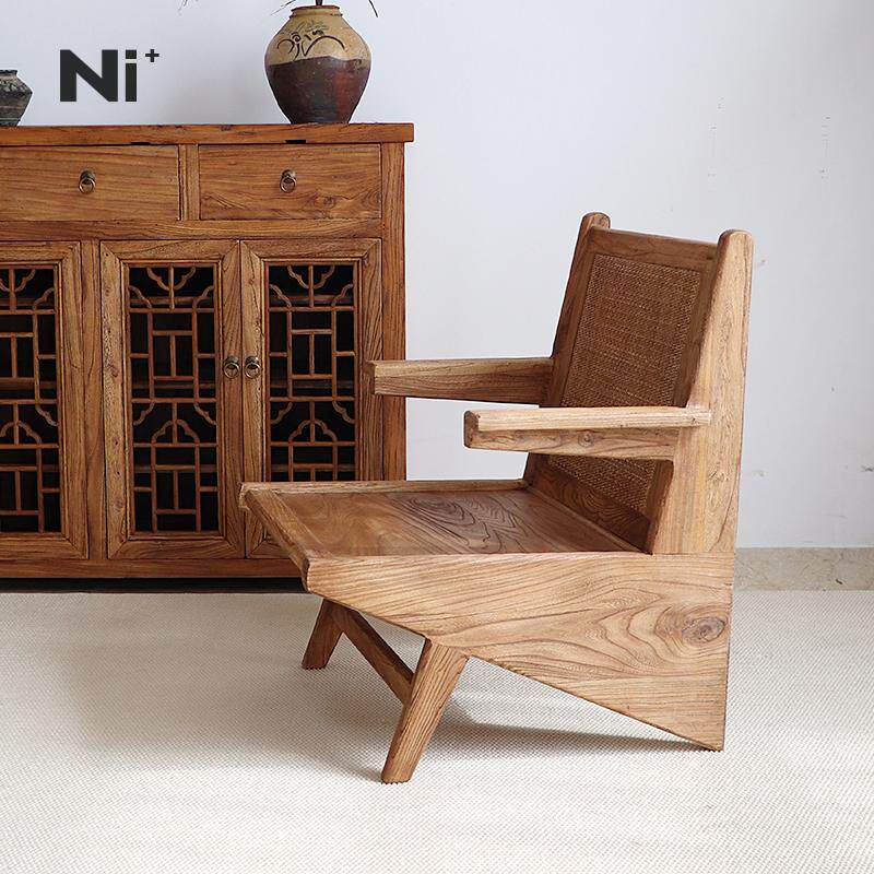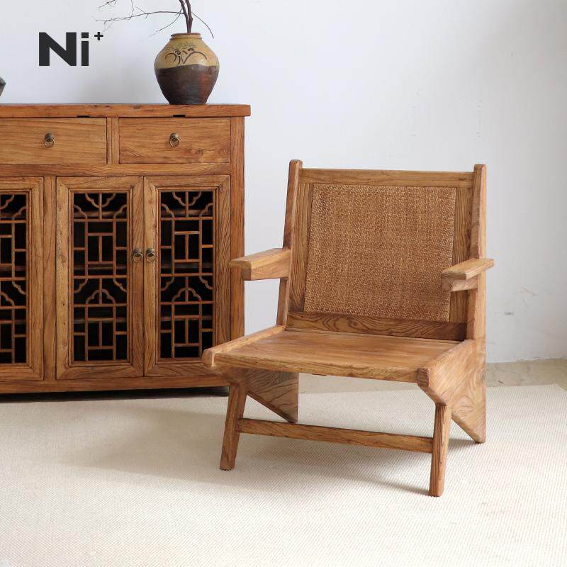 Ni+尼家侘寂风袋鼠椅子实木沙发椅阳台休闲躺椅藤编民宿老榆木椅