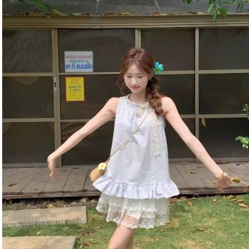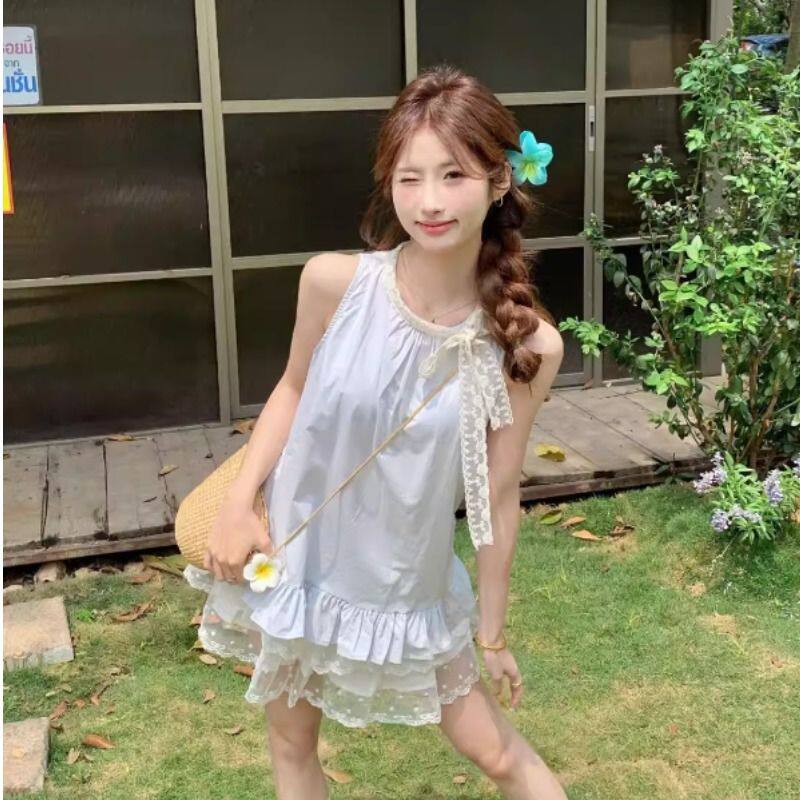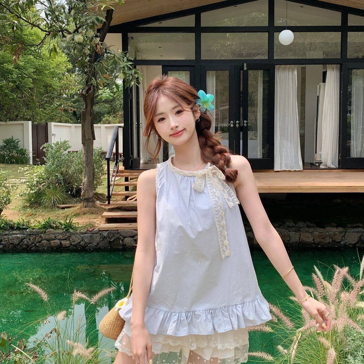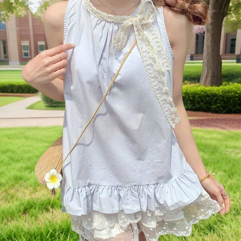 2026春夏薄荷花边圆领无袖背心上衣多巴胺蕾丝花边甜美清新显瘦