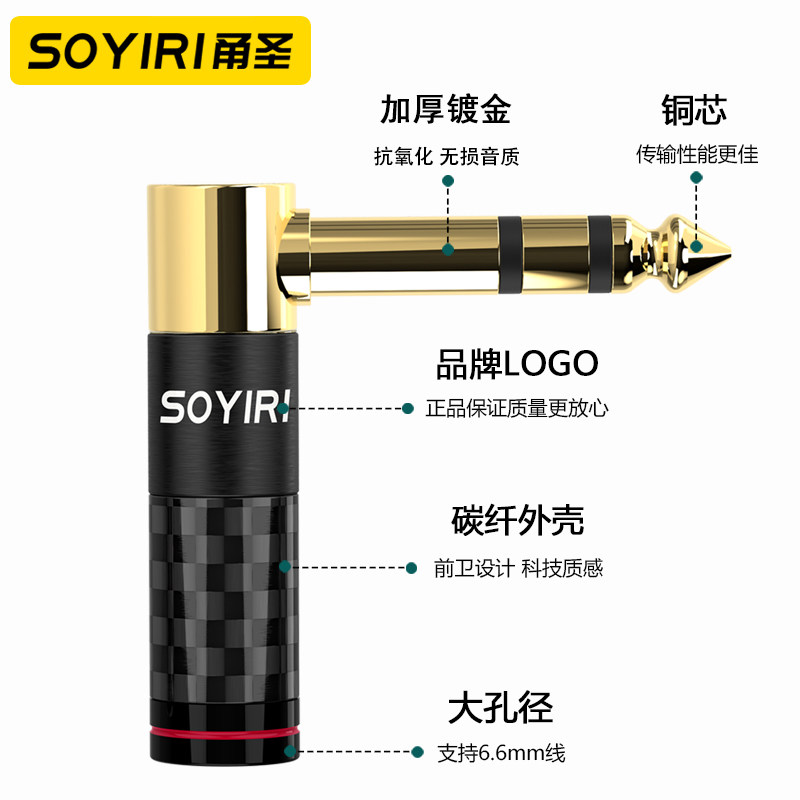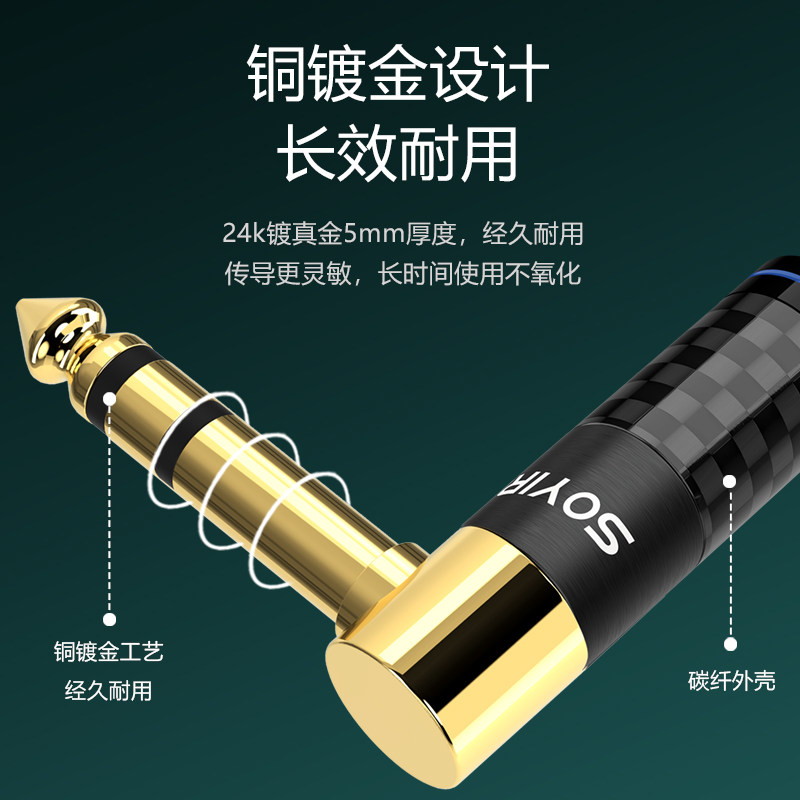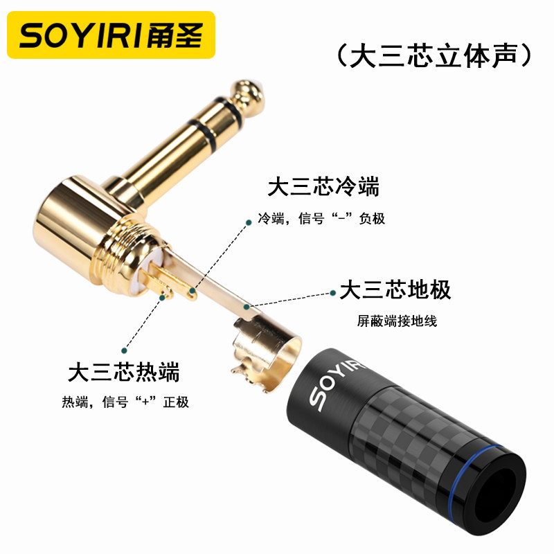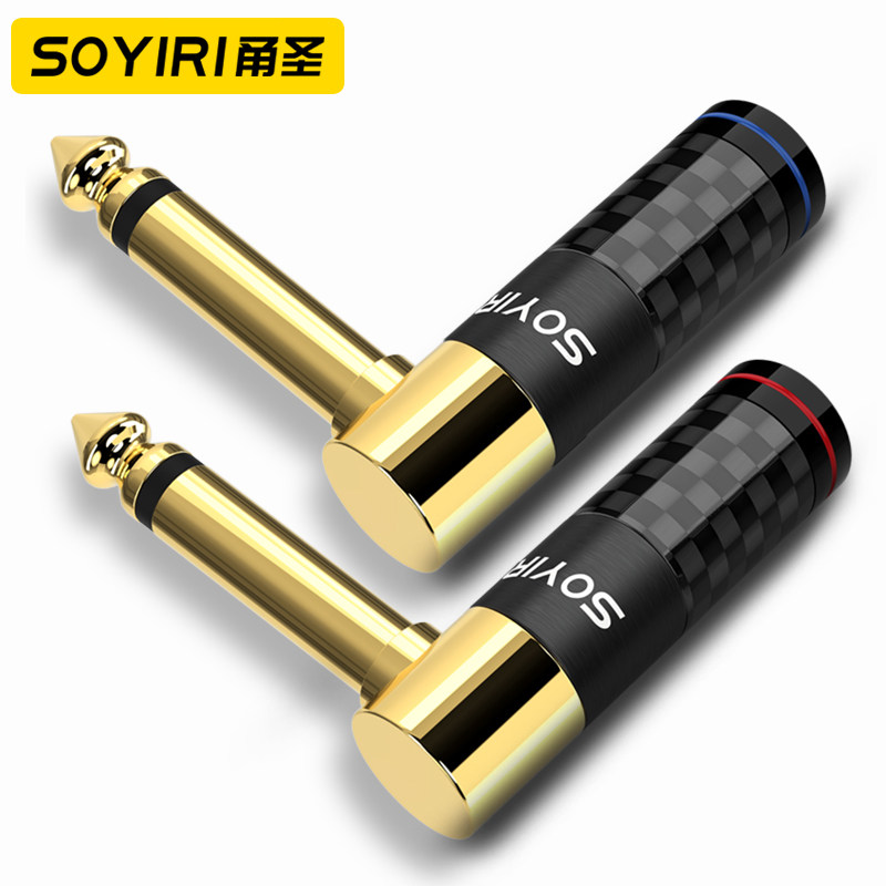 SOYIRI 铜镀金6.35mm弯型90度大二三芯单双声道焊接插头6.5音频线吉他电子钢琴调音台功放话筒音箱响连接插头