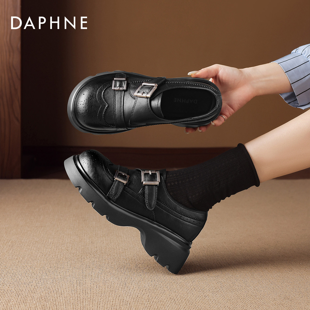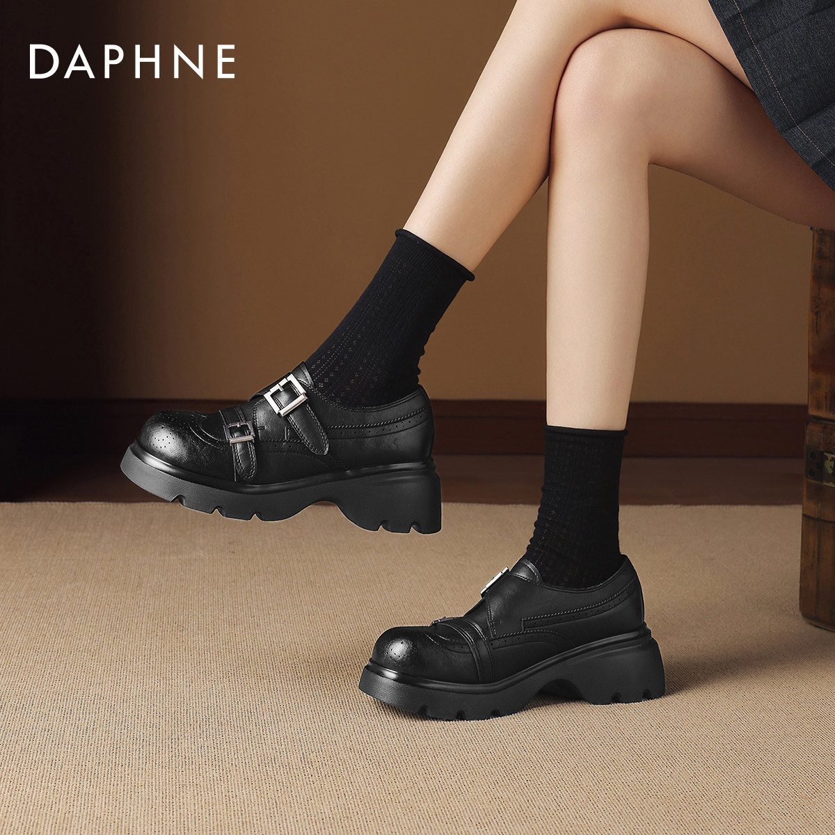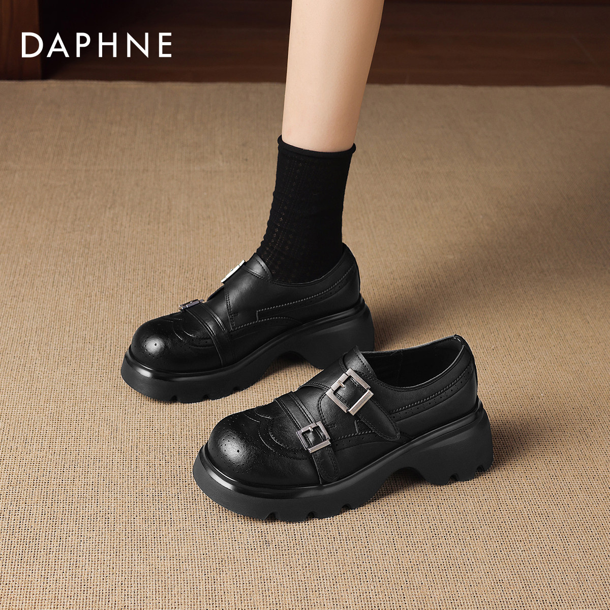 达芙妮厚底乐福鞋女2026新款春季英伦风小皮鞋黑色通勤布洛克单鞋