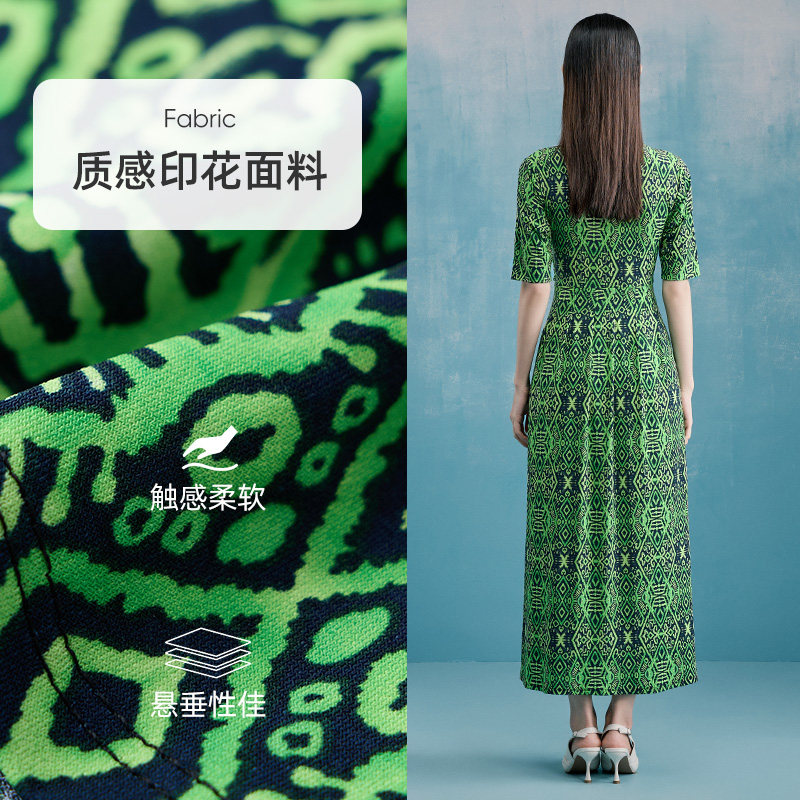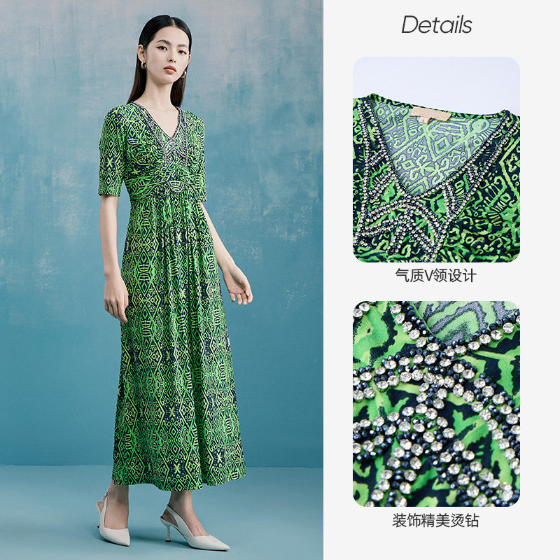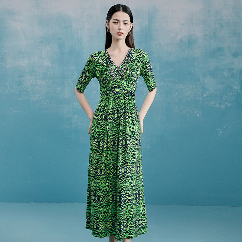 马天奴春夏新款女绿色V领印花连衣裙短袖收腰长裙钉珠礼裙子气质