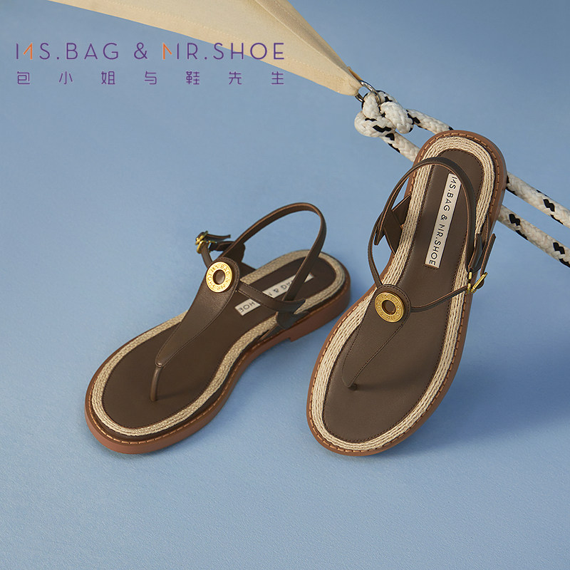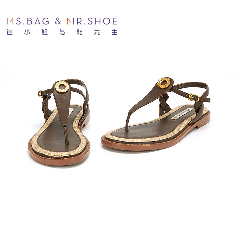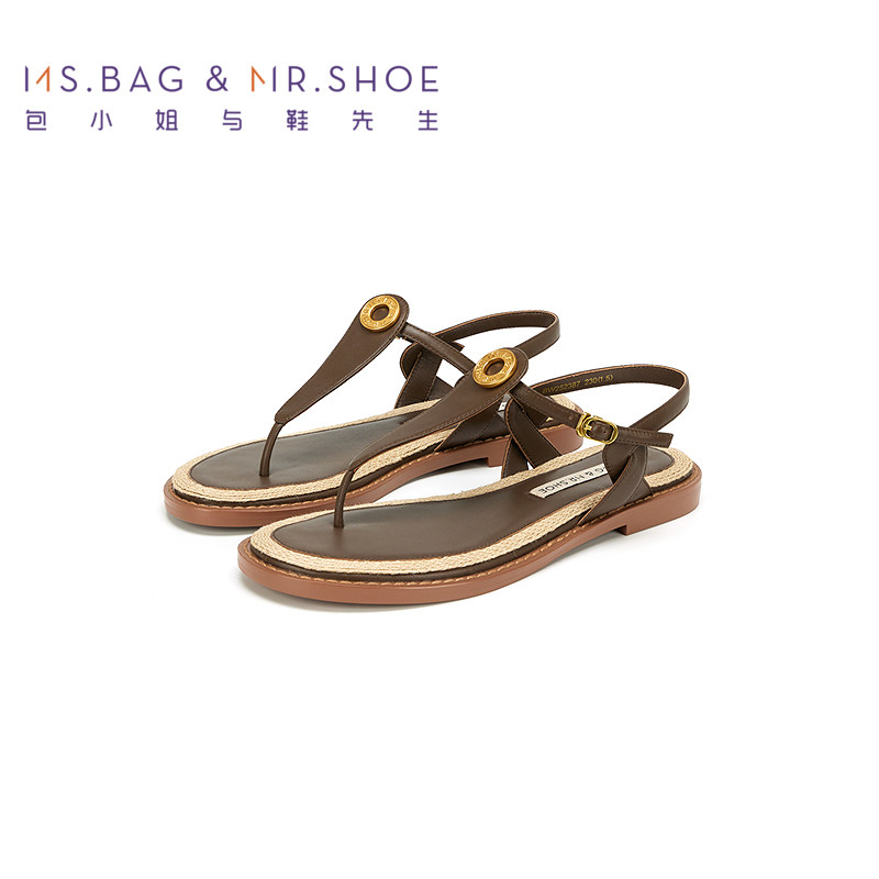 包小姐与鞋先生2025年夏季新款电镀五金夹趾平底凉鞋女252387