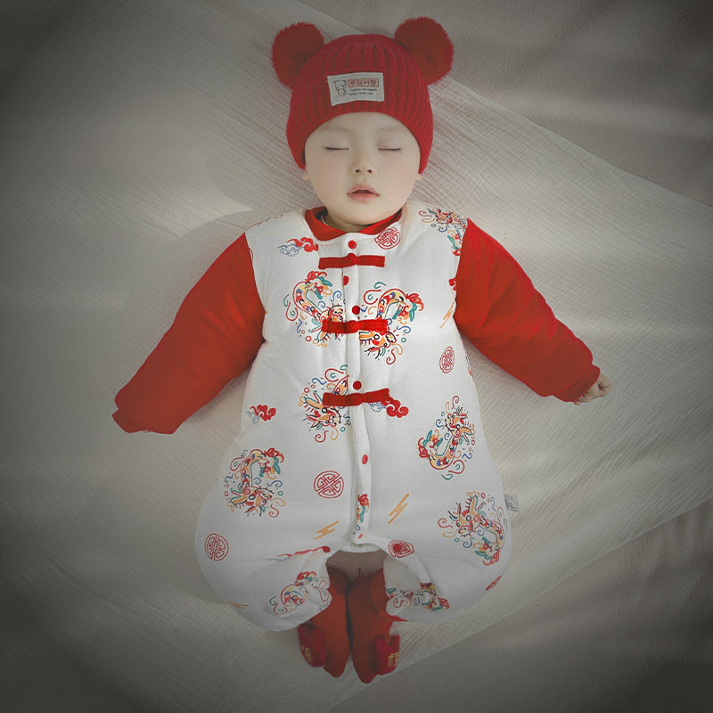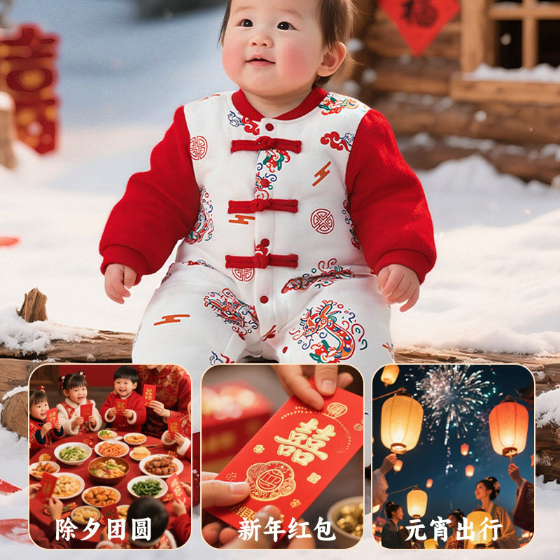 婴儿衣服冬季新年拜年喜庆新生儿连体衣初生男女宝宝满月周岁百天