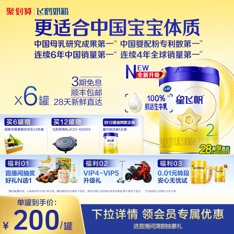 【官方正品】飞鹤星飞帆2段婴幼儿配方牛奶粉700g*6罐5HMO专利OPO