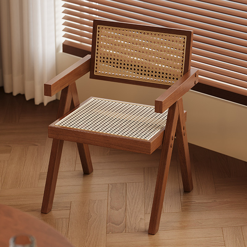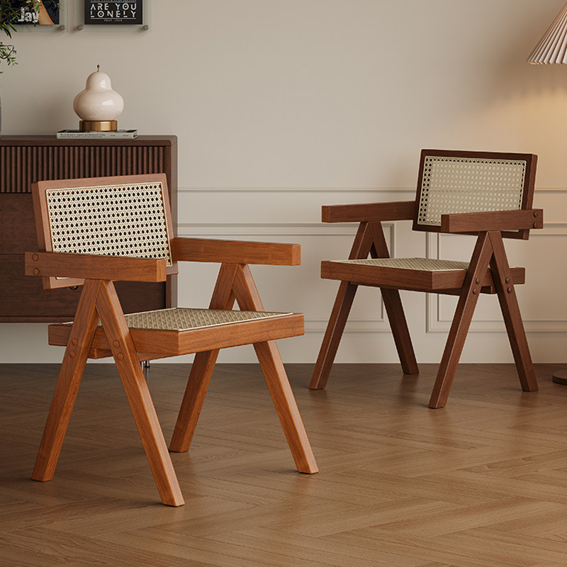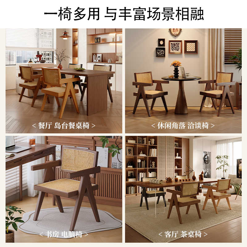 实木餐椅侘寂风昌迪加尔椅扶手中古藤编餐厅餐桌椅家居阳台原木色