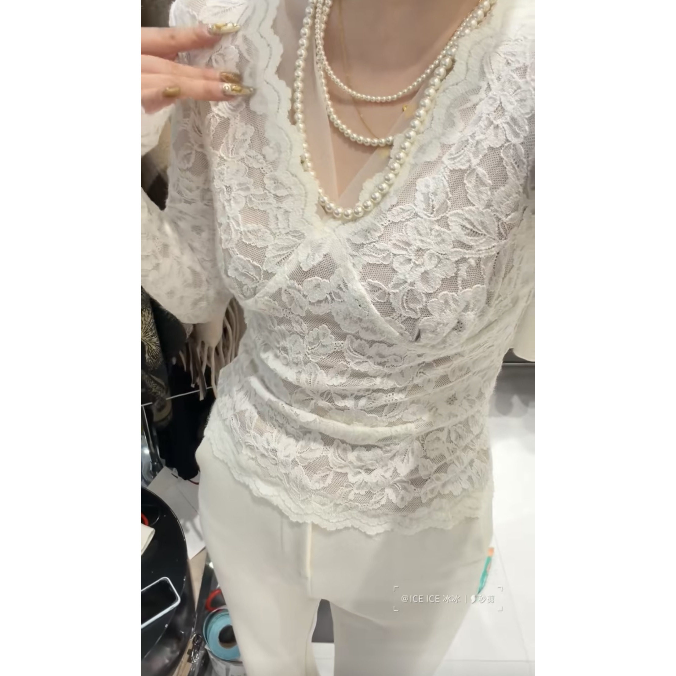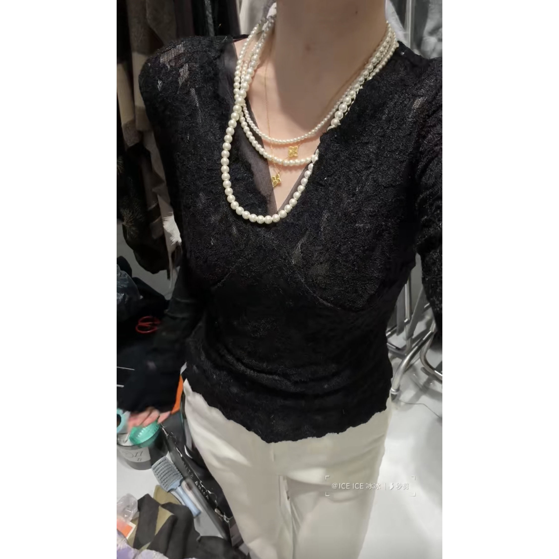 2025秋冬季新款韩系百搭显瘦长袖蕾丝衫女纯欲性感气质V领上衣