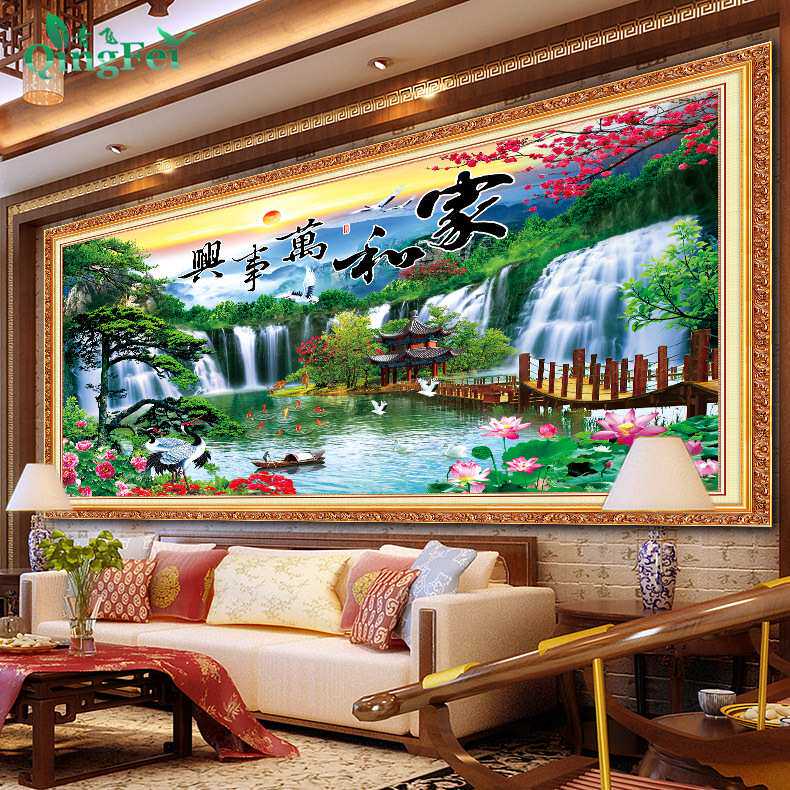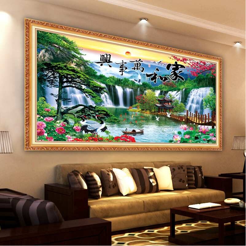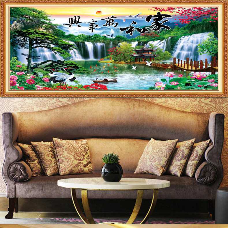 青飞精准印布家和万事兴迎客松流水生财十字绣仙鹤客厅大气挂画绣