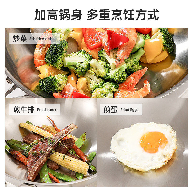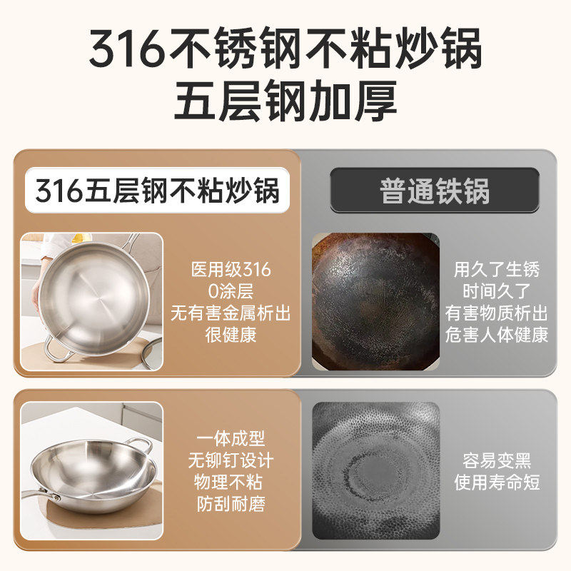 三四钢?不锈钢0涂层炒锅家用316L食品级加厚圆底炒菜锅官方正品