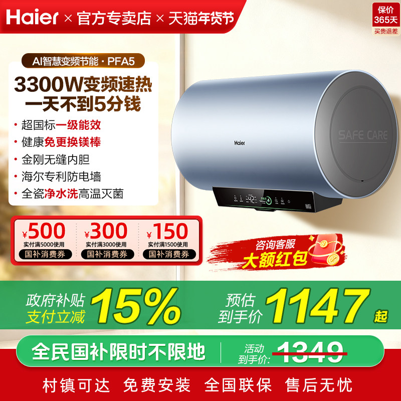 国补海尔电热水器家用60升卫生间洗澡80升一级能效变频小蓝瓶PFA5