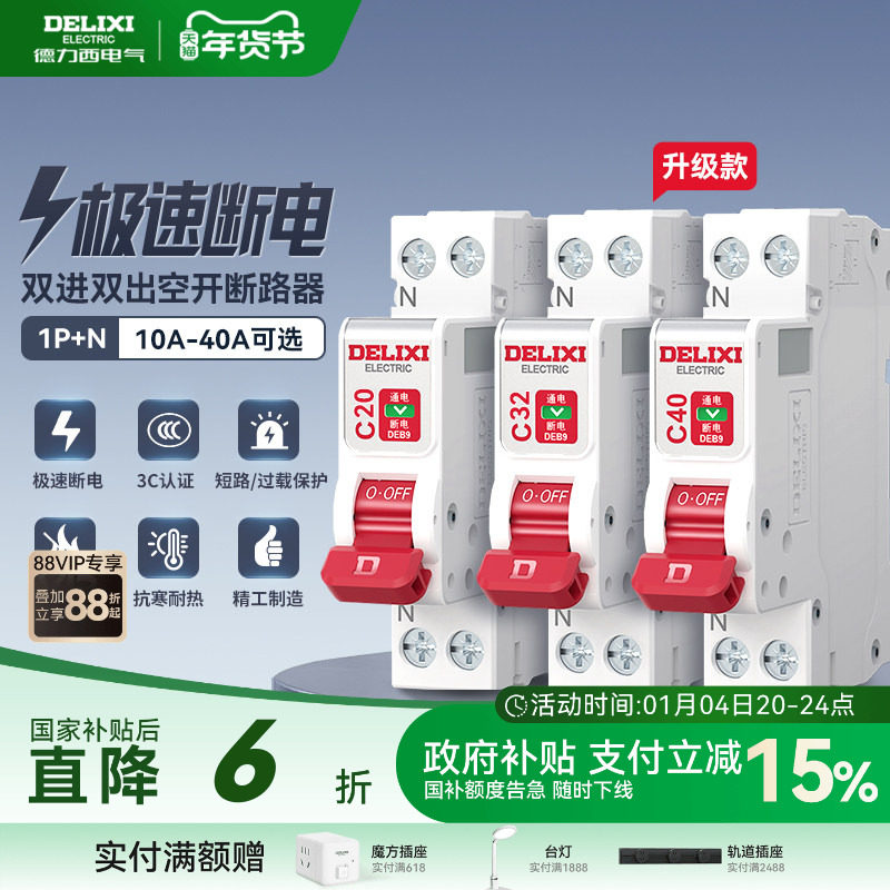 德力西断路器1P+N相线+中性线双进双出短路保护空开双线空气开关