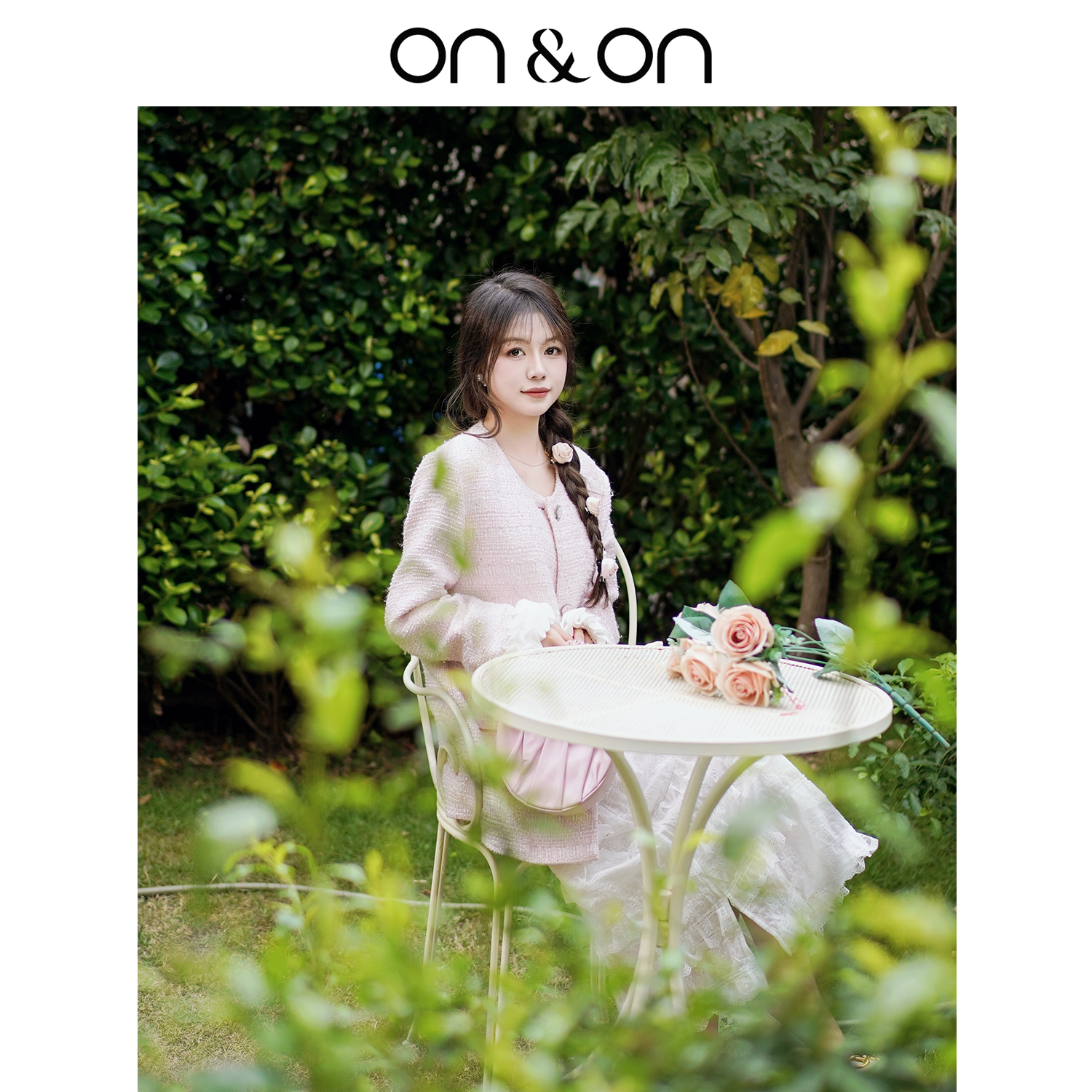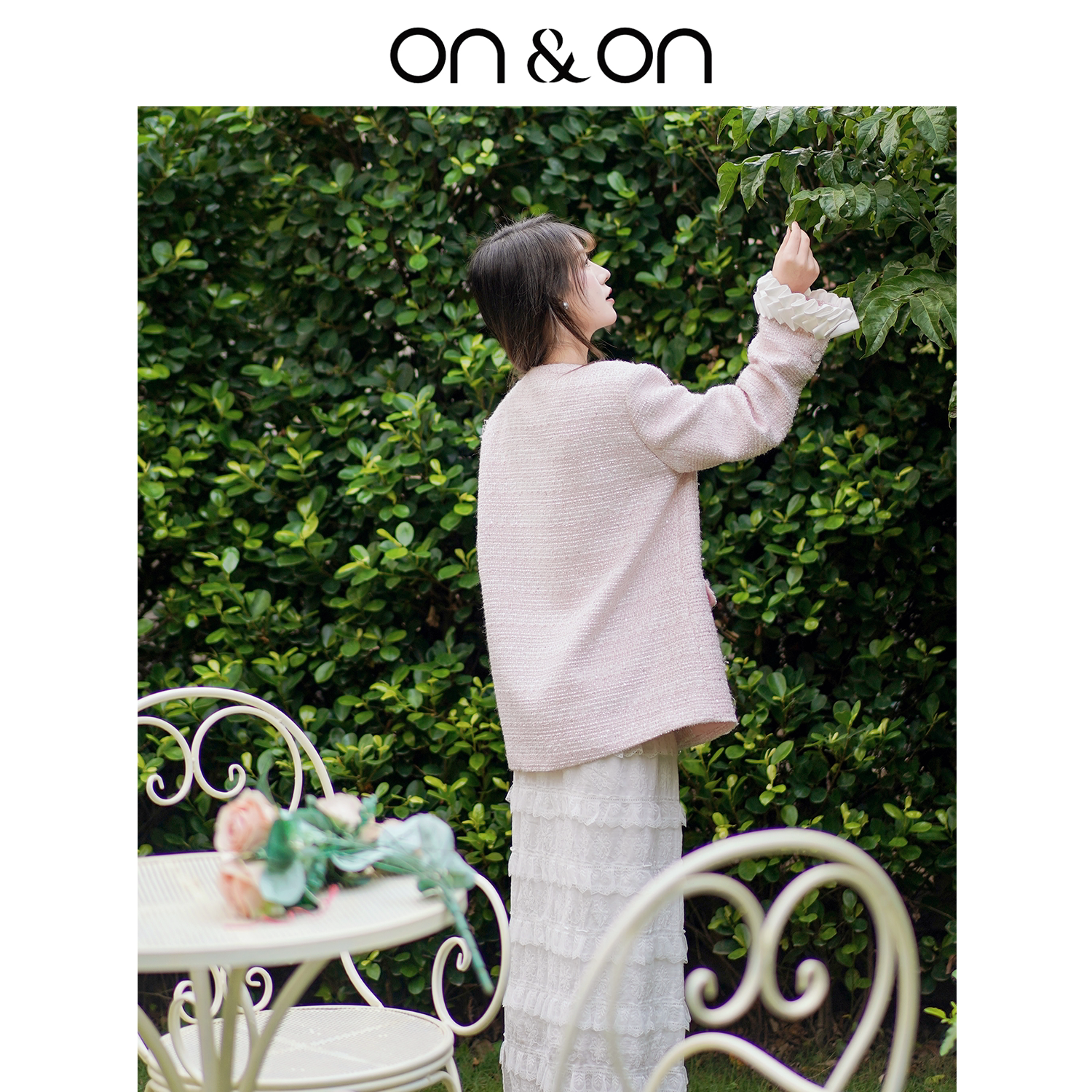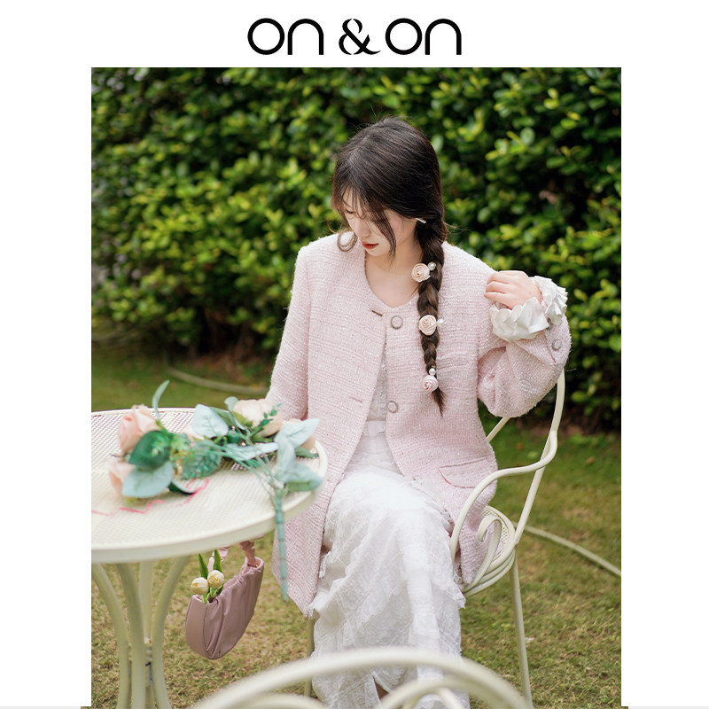 ON&ON/安乃安冬季新款韩系温柔花瓣袖粉色中长款甜美小香风外套