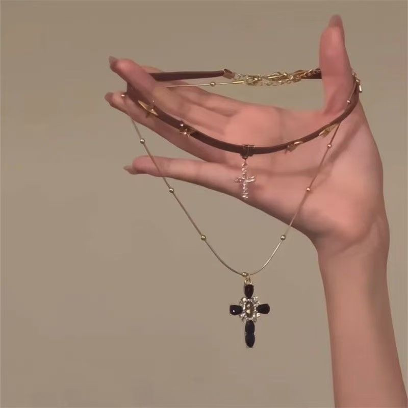 「黑绳甜酷心」叠戴项链女辣妹黑皮绳链锁骨链choker颈链酷风钛钢