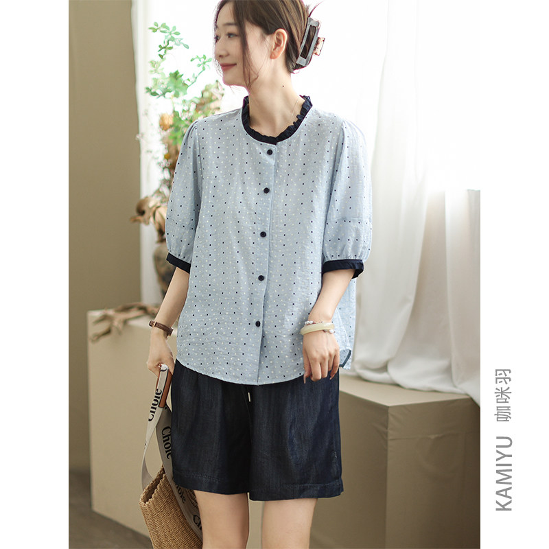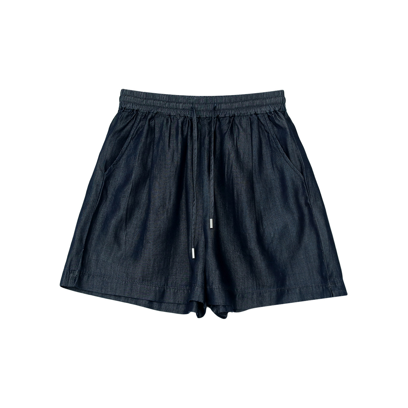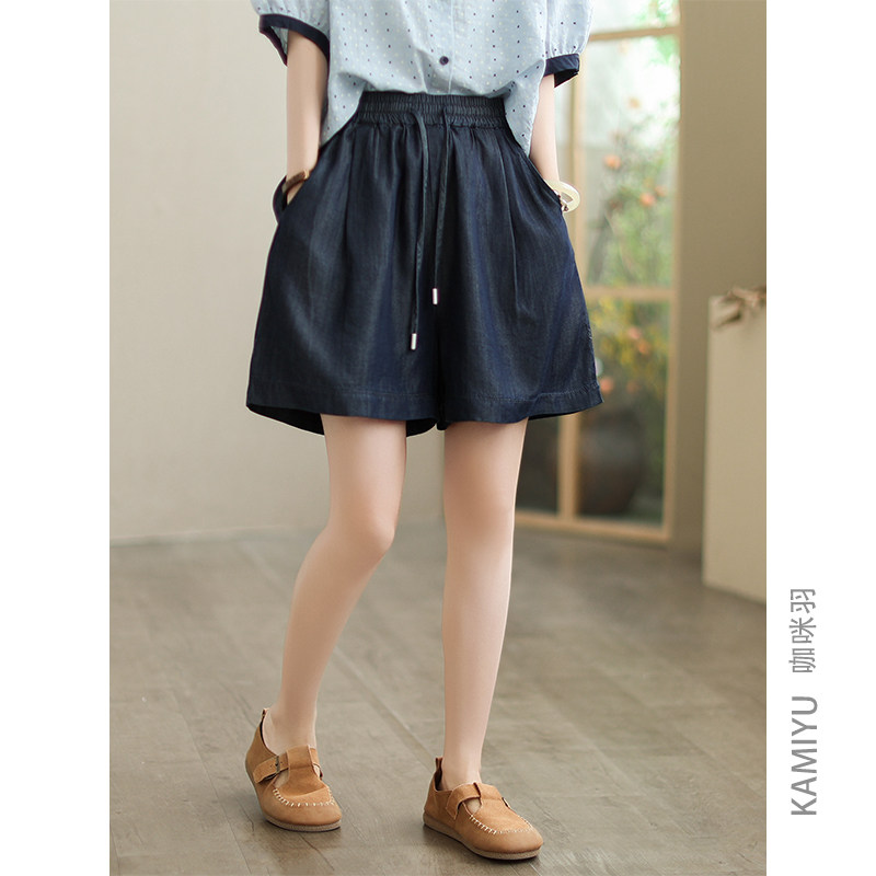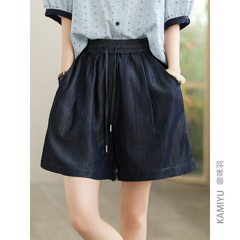 咖咪羽100%棉牛仔短裤女深蓝松紧腰时尚百搭简约直筒宽松女装短裤