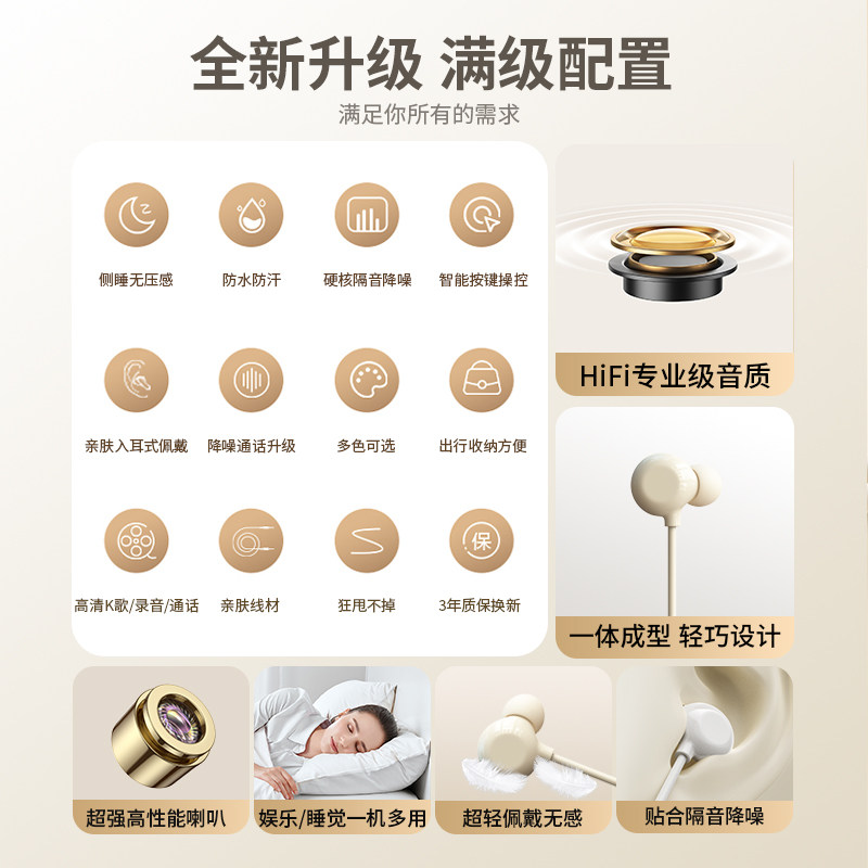 官方正品睡眠耳机有线入耳式typec接口高音质降噪k歌游戏手机圆口