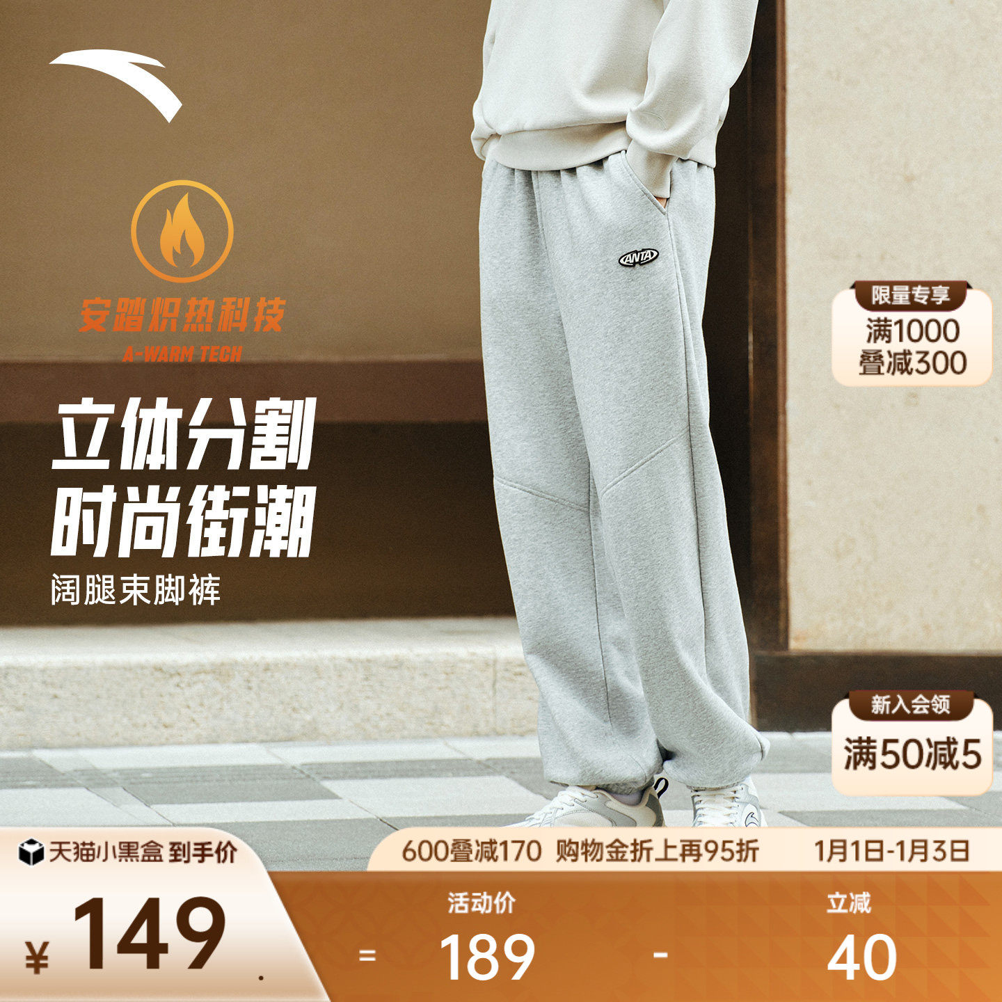 安踏加绒运动卫裤男士2025冬季新款宽松束脚针织长裤灰色休闲裤子