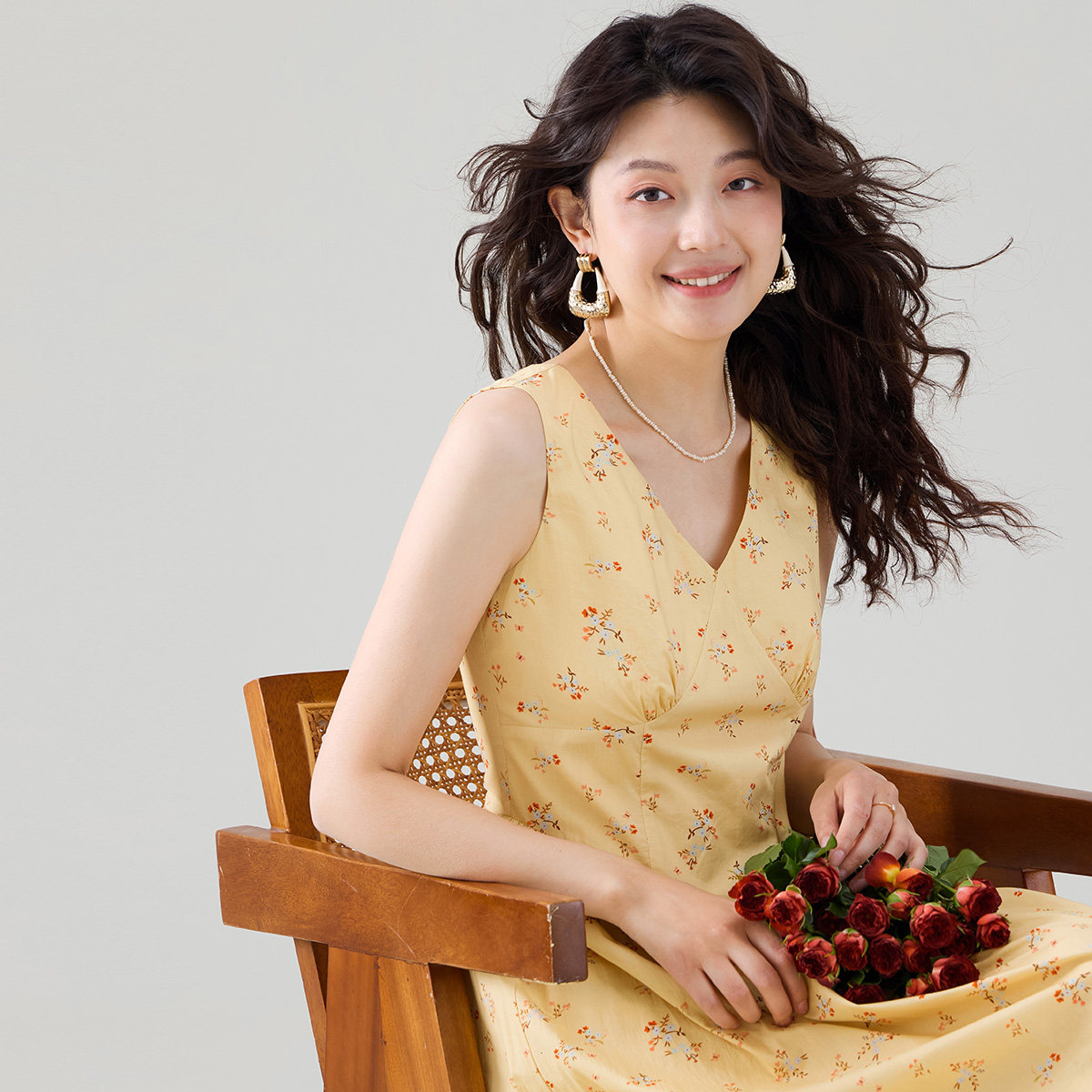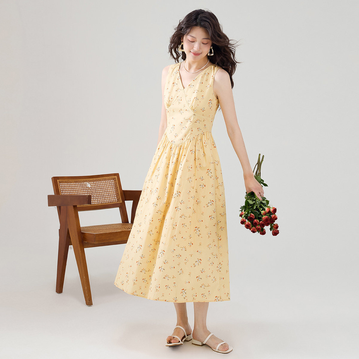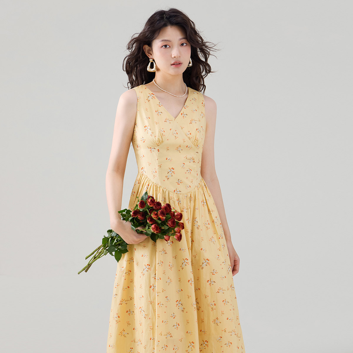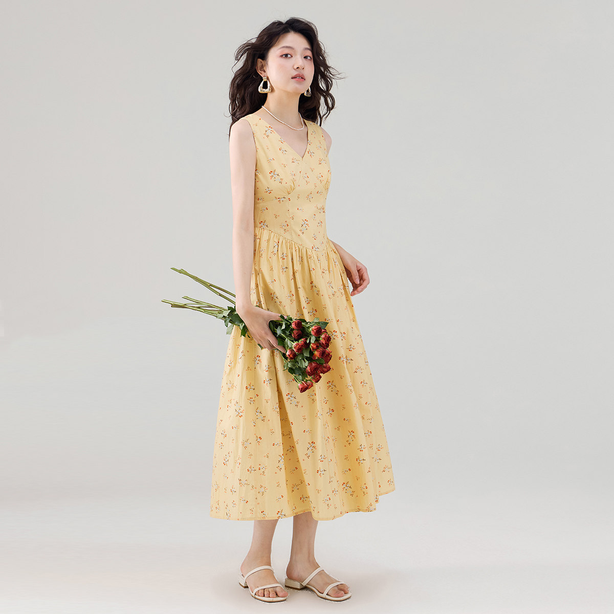夏季v领无袖背心裙女法式高级感碎花连衣裙a字长款气质纯棉裙子